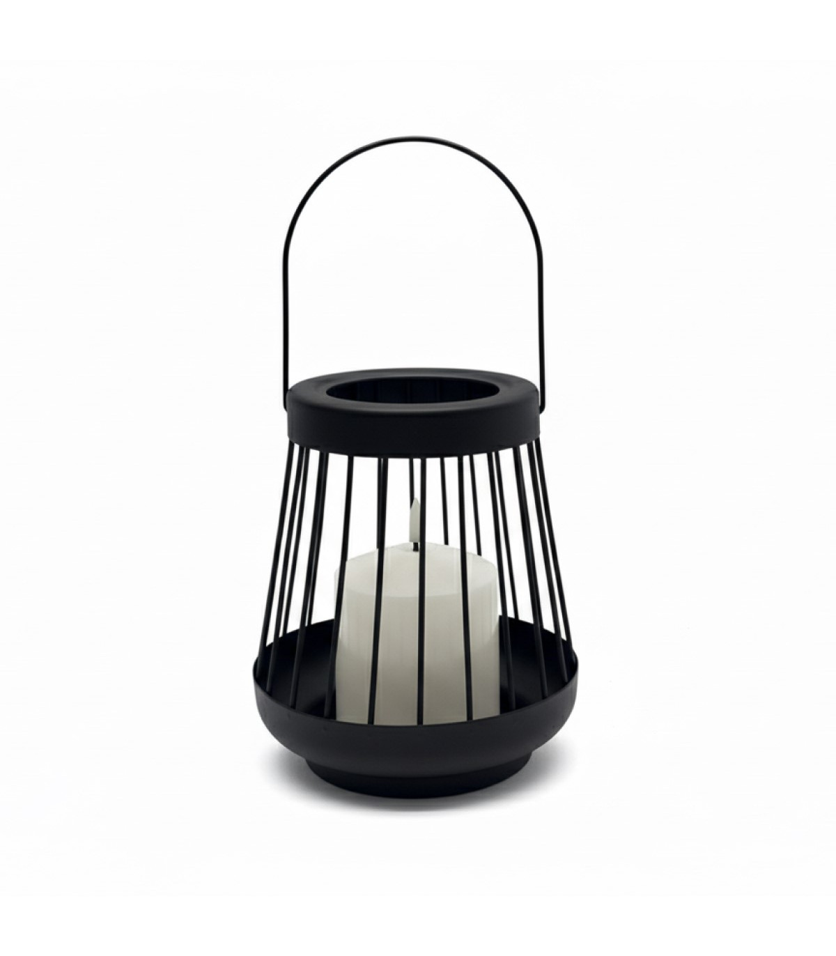 Un farol metálico de 18 cm de alto con una vela de luz LED blanca cálida de 7.5 cm de diámetro y 10 cm de alto. La llama titila con un efecto realista. Usa 1 pila CR2032 incluida. Incluye switch on-off.