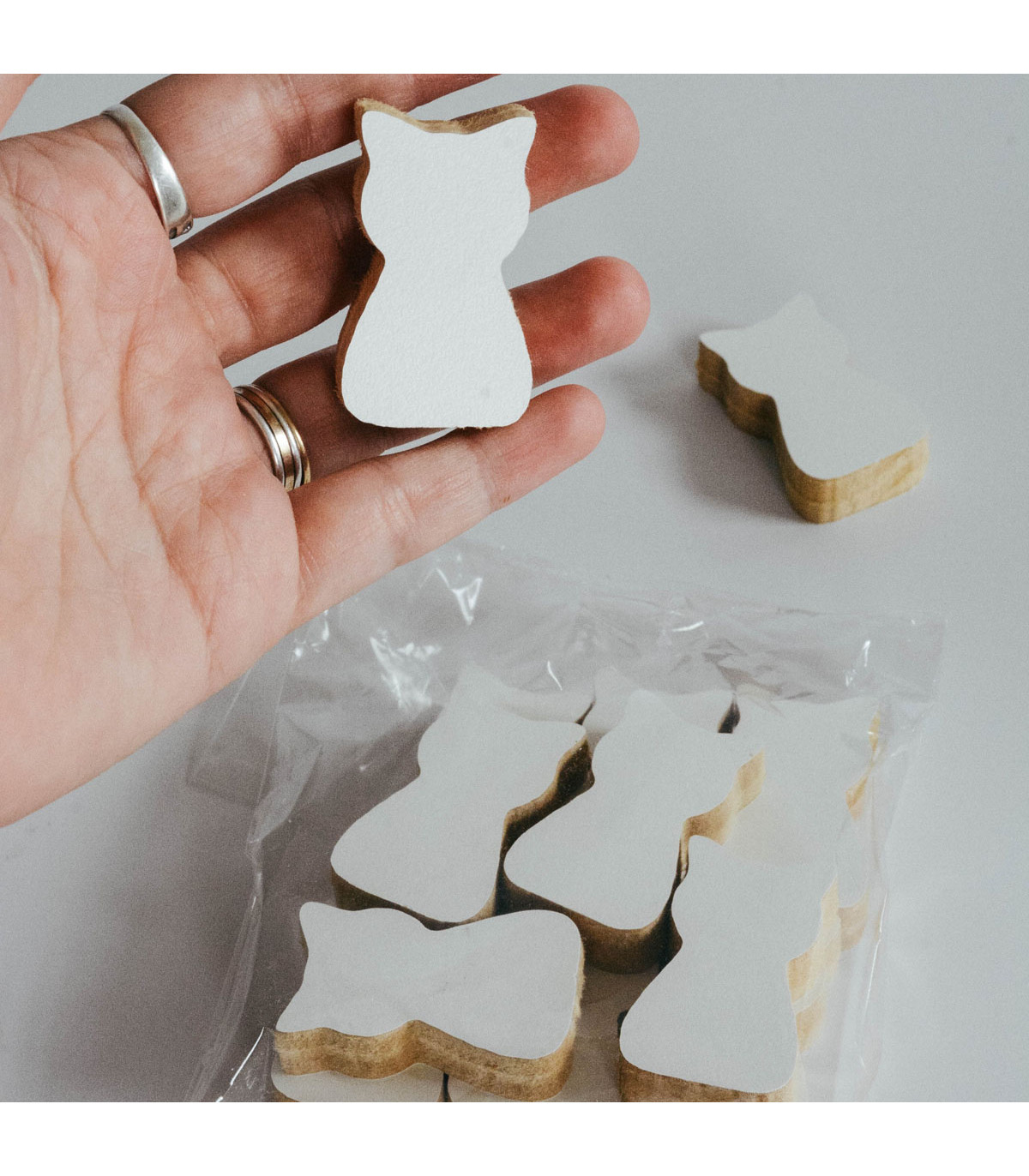 10 adornos con forma de gato de 4 cm de alto cada uno de madera melamina blanca de 1.2 cm de espesor. Hechos en madera recuperada de los sobrantes de muebles hechos a medida.
