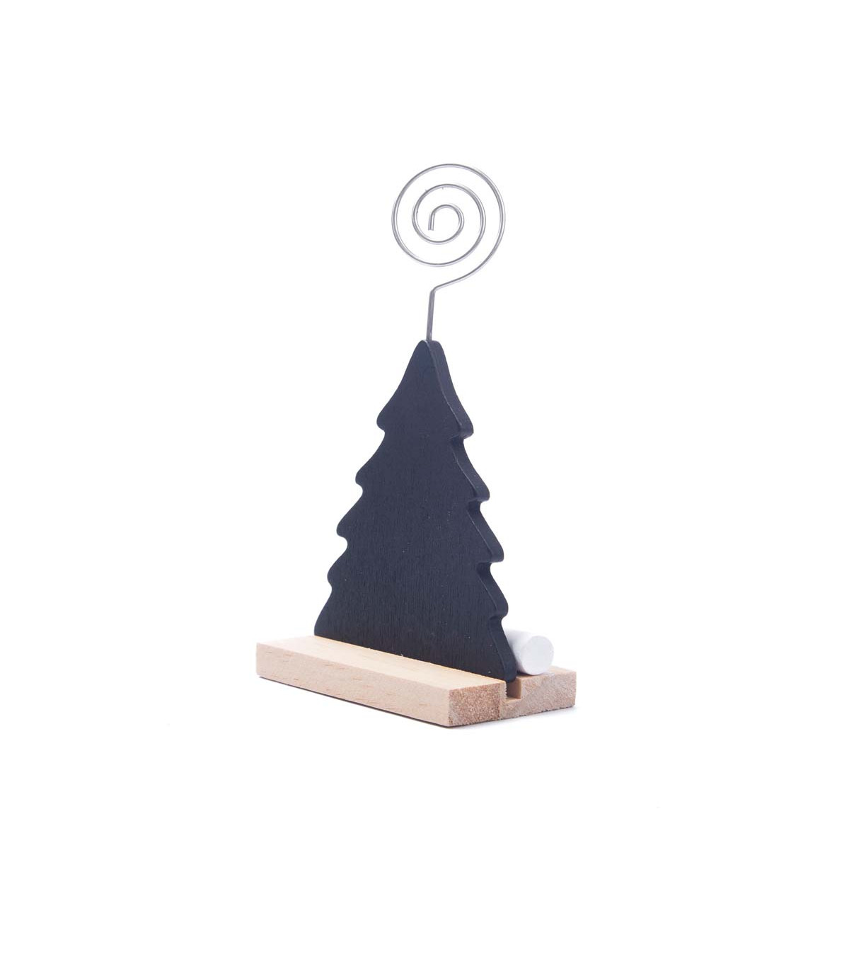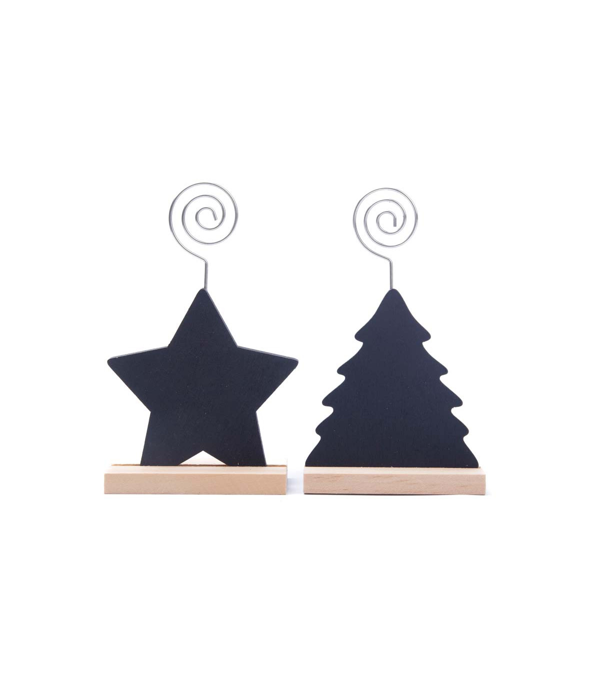 Un adorno de 13 cm de alto con forma de pino o estrella para sujetar una tarjeta o una foto. Hecho en madera contrachapada con pizarra negra para poder escibir. Incluye una tiza en la parte inferior.