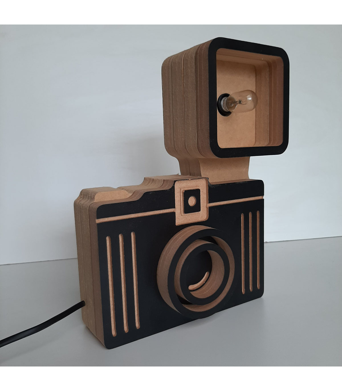 Una lámpara con forma de cámara retro de 30 x 25 cm de madera melamina de 7.5 cm de espesor. Cable de 1.30 metros, interruptor y ficha inyectada. Incluye un foco incandescente con rosca Mignon de 15 W. Hechos en madera recuperada de sobrantes de muebles.
