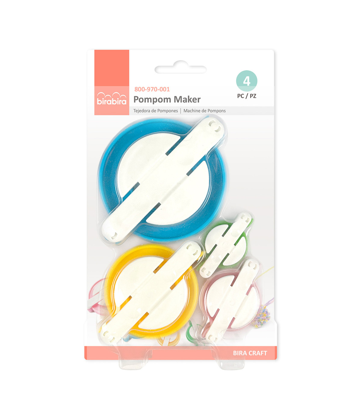 Creá pompones perfectos de manera fácil y divertida. Un práctico set que incluye cuatro tamaños diferentes, 3.8 cm, 4.8 cm, 6.8 cm y 8.7 cm, que permiten crear pompones de diversos tamaños para adornar tus creaciones.