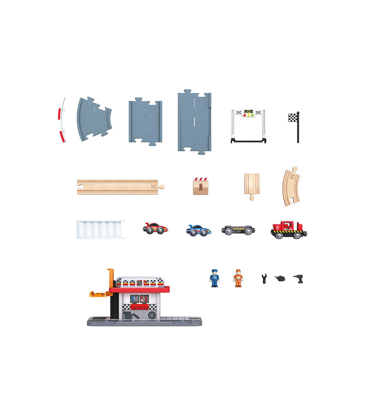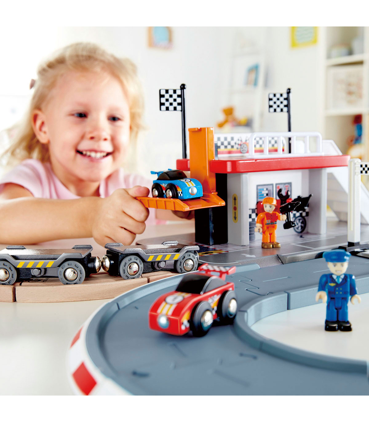 Agregá una nueva dimensión de diversión con esta pista y estación de autos de carrera. Transportá tus autos a la pista y competí.