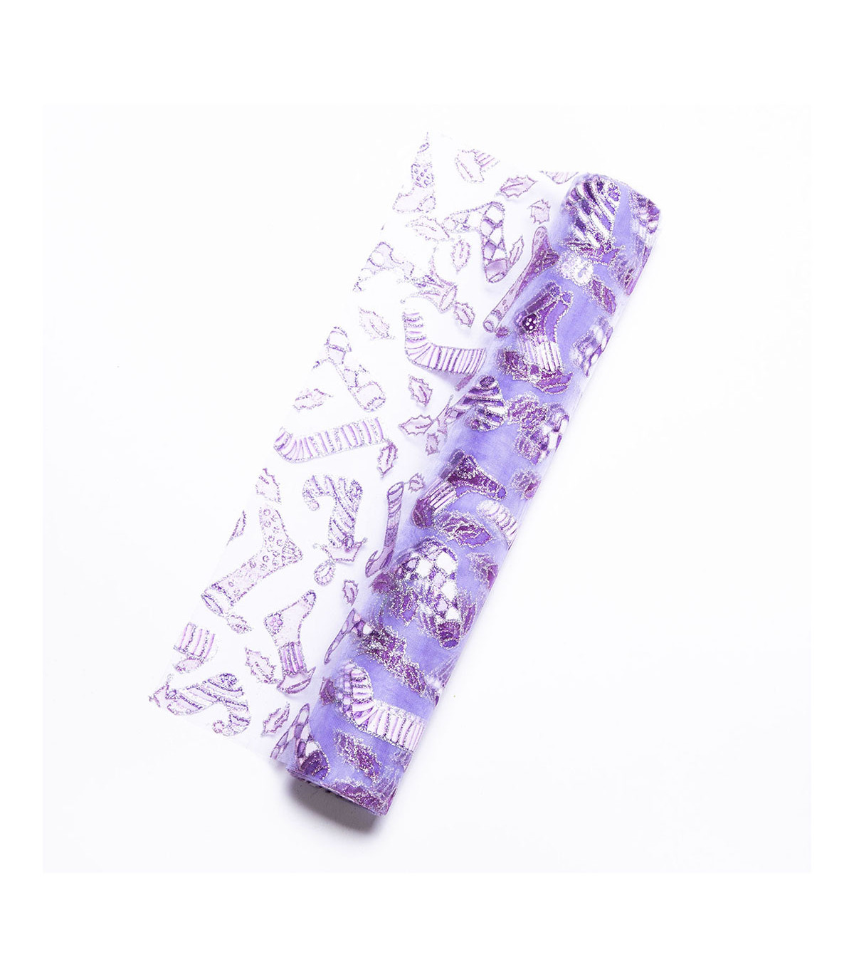 Rollo de tela traslúcida con figuras de botas y medias navideñas, de 35 cm de ancho y 9.1 metros de largo. Ideal para decorar el árbol de Navidad, ramos, mesa o regalos.