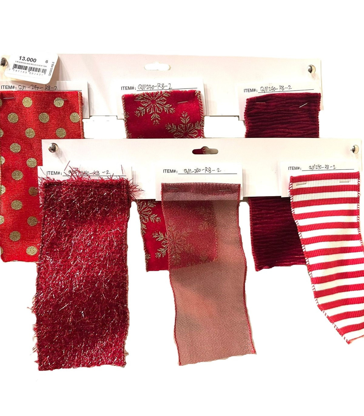 Una cinta decorativa de tela de 8.9 cm de ancho y 10 metros de largo con 7 diseños surtidos en tonos de rojo para decorar en Navidad.