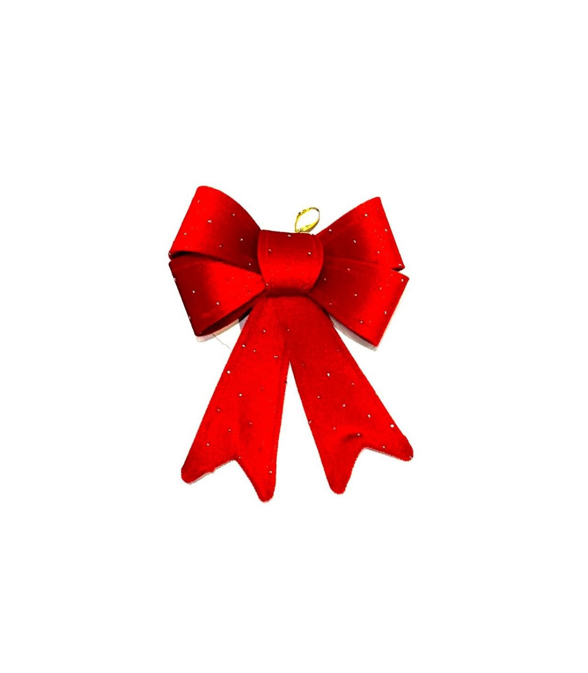 Un moño de tela con detalles plateados de 13 cm de ancho y 18 cm de alto para decorar la casa o el árbol en Navidad.