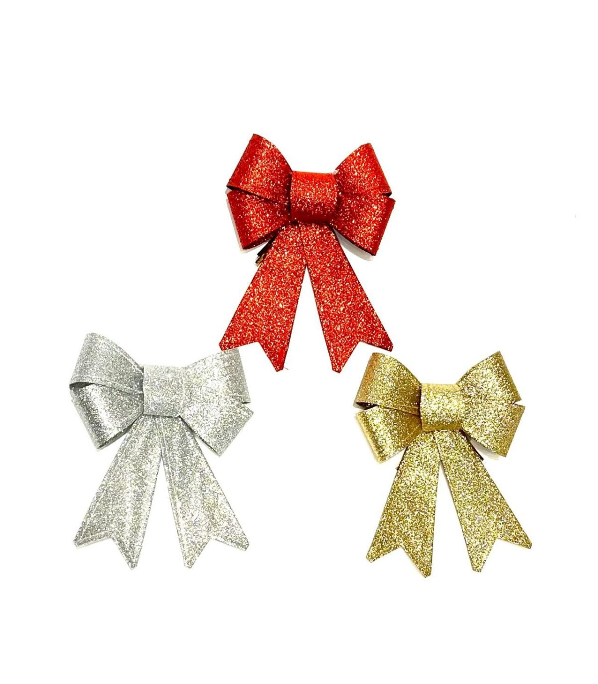 Un moño de tela de 13 cm de ancho y 18 cm de alto para decorar la casa o el árbol en Navidad. Vienen en diseños surtidos rojo, plateado y dorado.