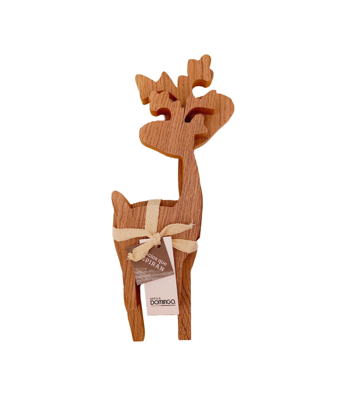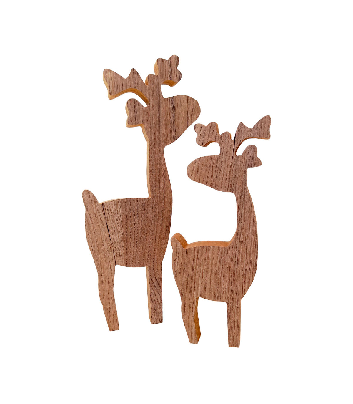 Dos adornos de madera con forma de renos, uno de 27 cm de alto y otro de 20 cm de alto. Hechos en madera recuperada de los sobrantes de muebles hechos a medida.