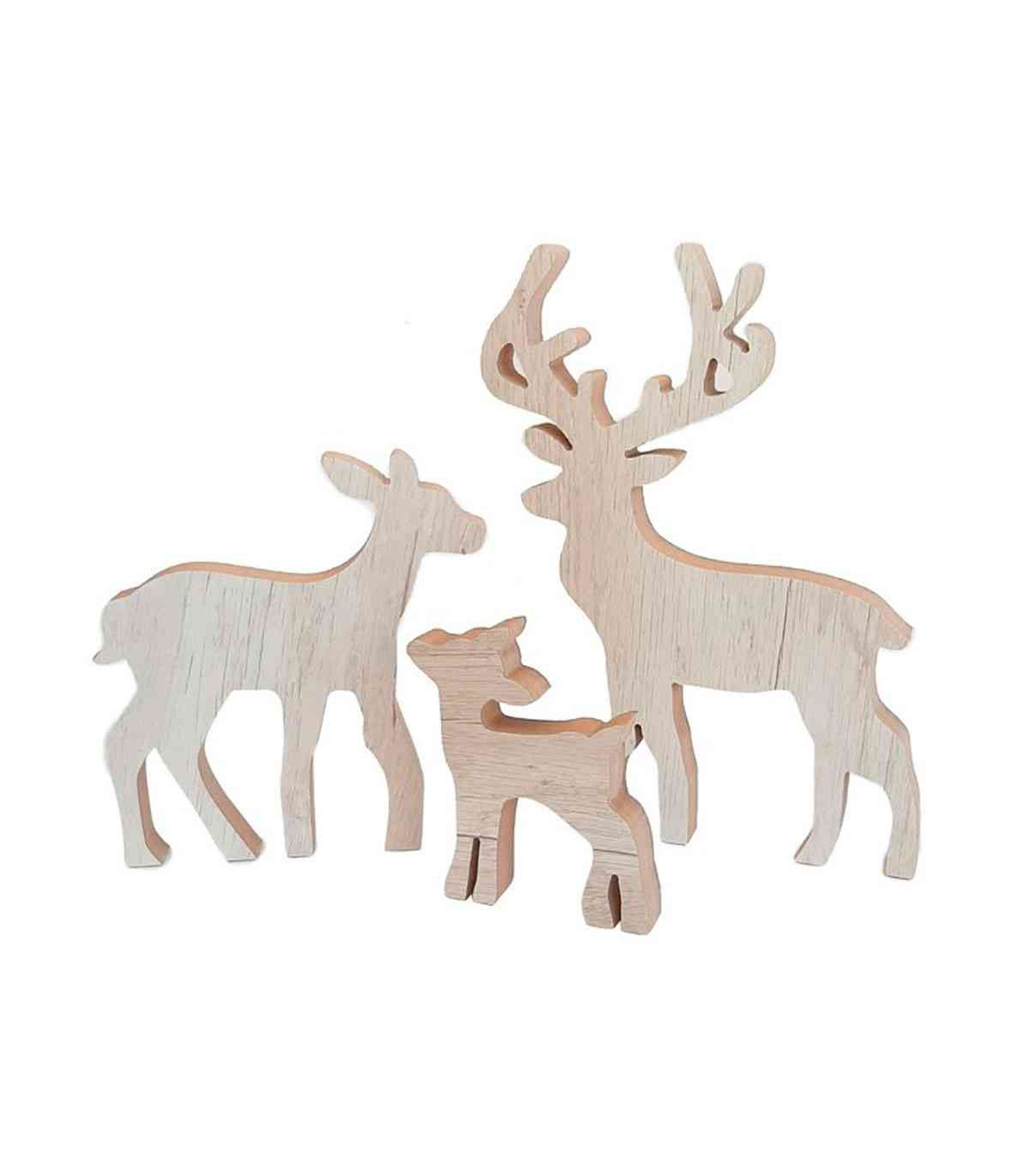 Tres adornos de madera que forman una familia de renos, uno de 20 x 25 cm, otro de 15 x 17 cm y otro de 10 x 12 cm. Hechos en madera recuperada de los sobrantes de muebles hechos a medida.