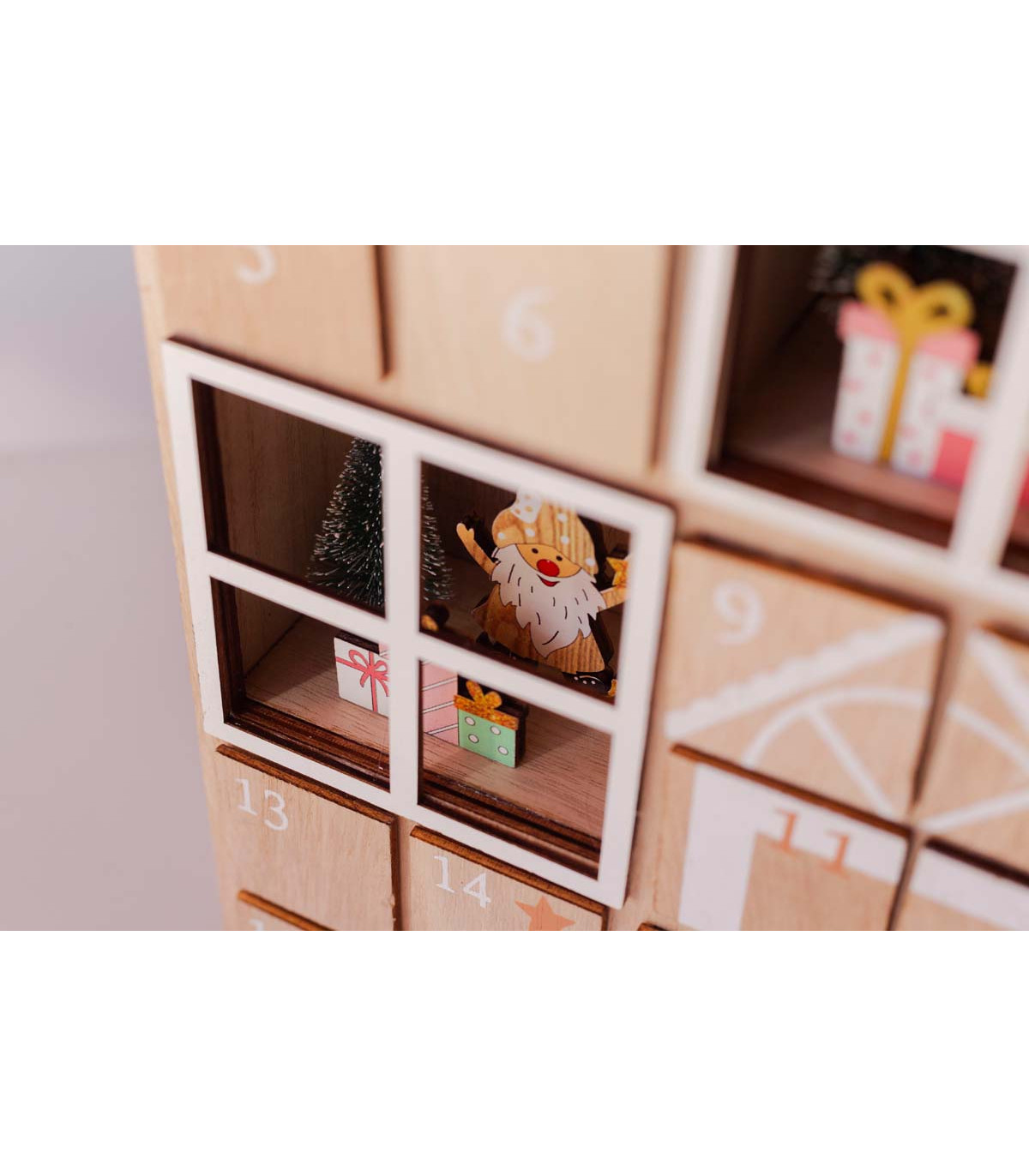 Un mágico calendario de adviento de madera con forma de casa de 37 cm de alto. Con 24 cajones para guardar sorpresas cada día hasta la Navidad. Además, tiene ventanas decorativas con 8 luces LED a pila. Usa 2 pilas AAA no inlcuidas.