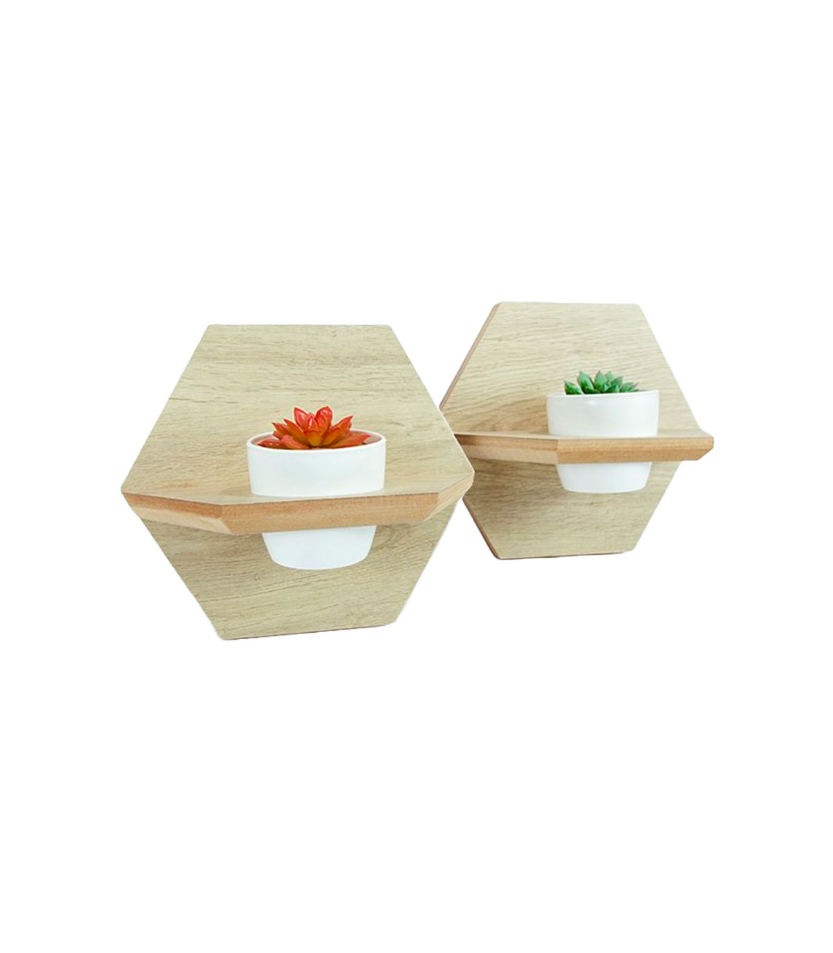 Dos hexágonos portamaceta colgables de 25x25 cm cada uno en madera melanina color Cajú en caja. Incluye macetas plásticas Premium nro. 8 sin perforaciones, tarugo nro. 6 y tornillo.