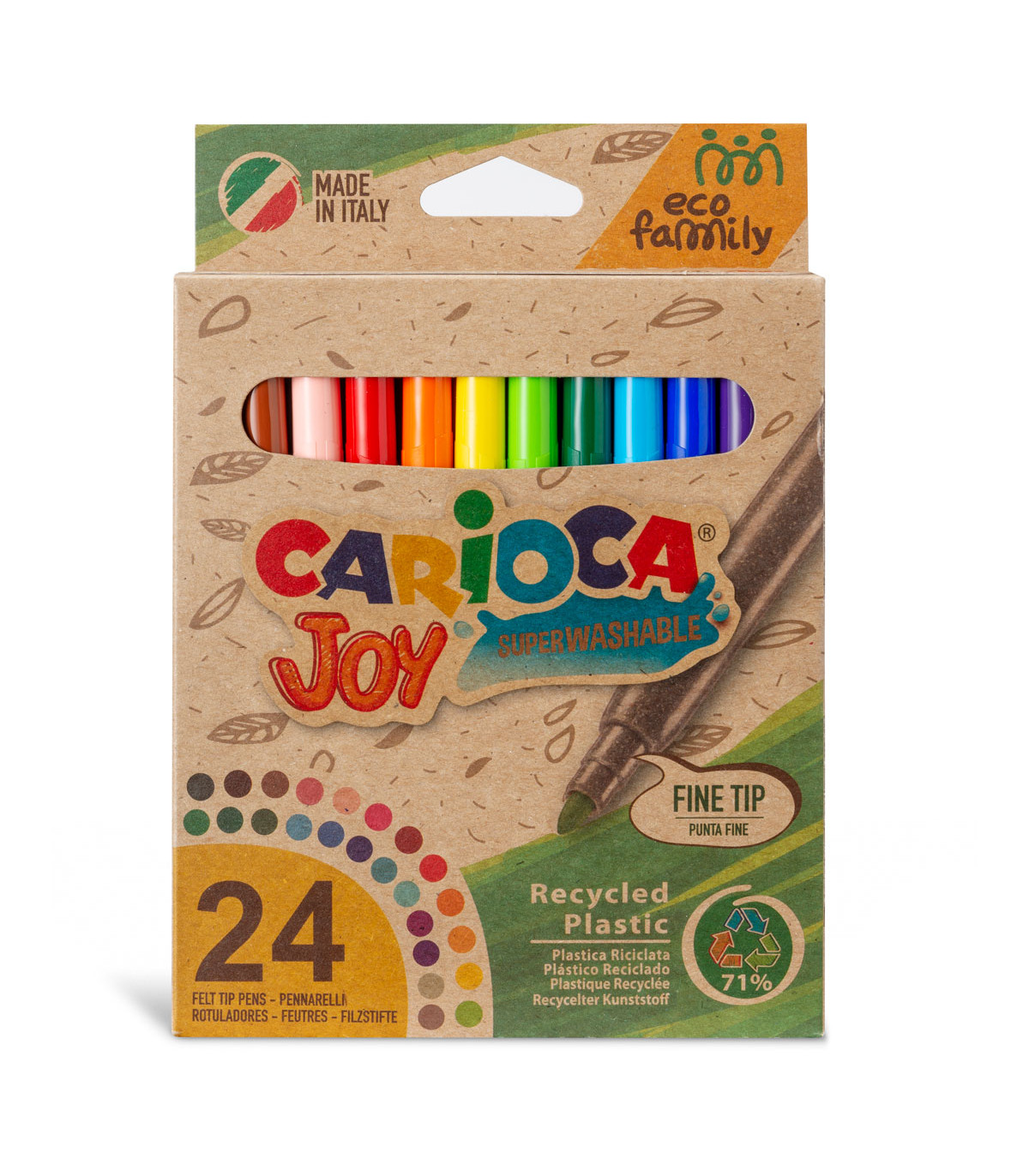 Una caja con 24 marcadores Joy de punta fina de 2,8 mm bloqueada de la línea Eco Family fabricado con 71% de plástico reciclado. Tinta super lavable no tóxica y capuchón ventilado.