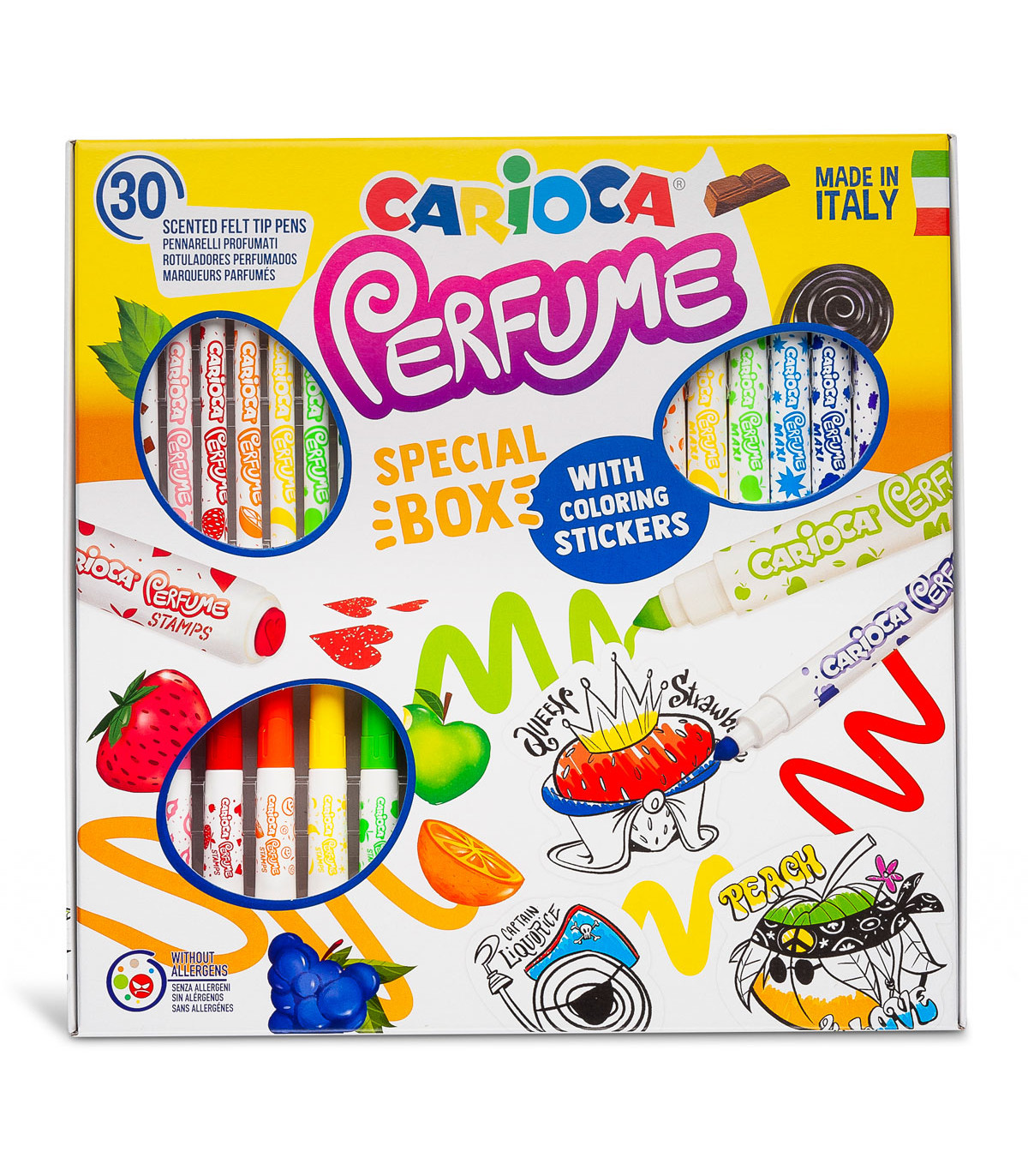 Una supercaja con 30 marcadores perfumados y con stickers para colorear. Tinta lavable y perfumada con aromas seleccionados para evocar las esencias naturales. Libre de sustancias alergénicas.