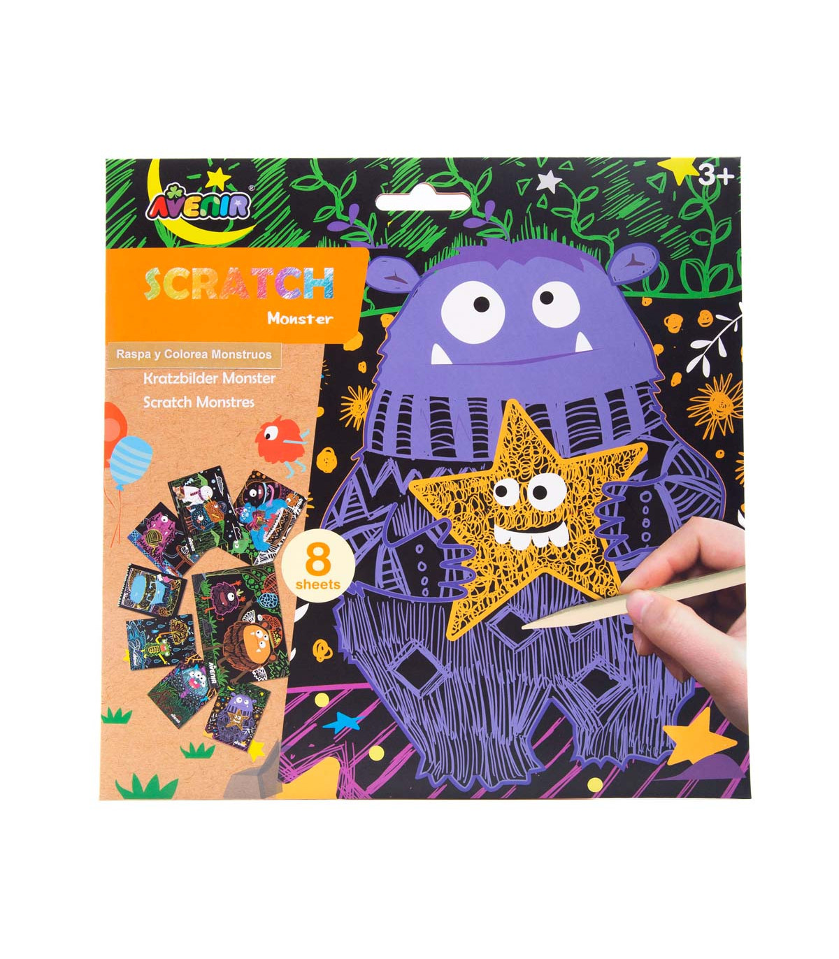 Un exhibidor con 20 unidades de scratch Junior en 4 diseños surtidos. Cada una incluye 8 hojas negras para rascar y crear diseños mágicos y un bolígrafo para rascar. Edad a partir de 3 años.