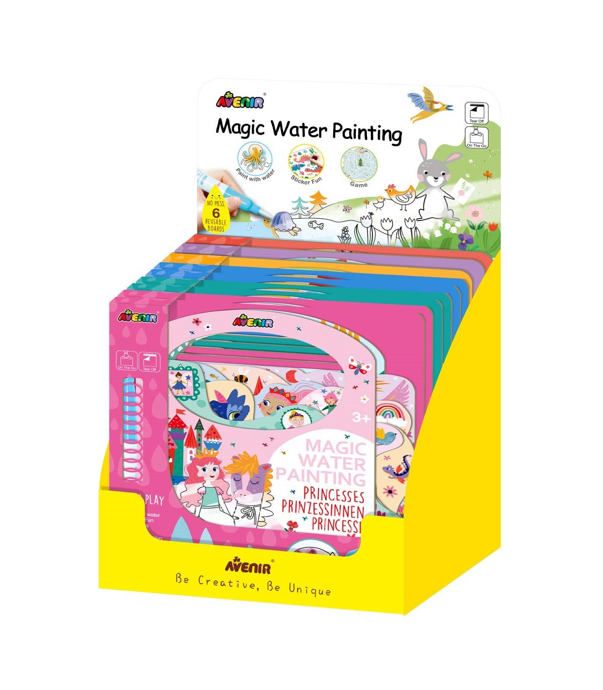 Un exhibidor con 9 unidades de kits de pinturas al agua en 6 diseños surtidos. Cada uno incluye 6 escenas reutilizables, 2 planchas de stickers y un marcador de agua recargable. Edad: +3 años.