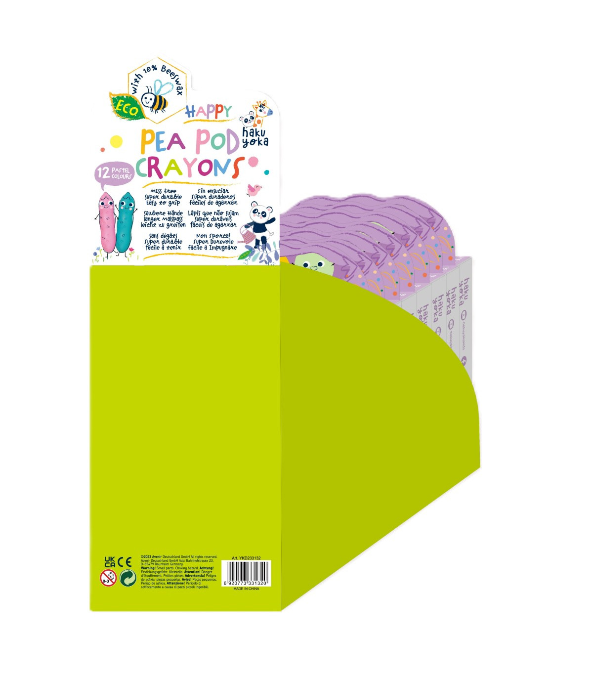 Una caja de 12 crayones de colores pasteles con forma de vaina de guisantes. El mínimo de compra de 12 unidades viene con exhibidor. Diseñados para manos pequeñas. Hechos con un 10 % de cera de abejas, no ensucian y los materiales de papel tienen certific