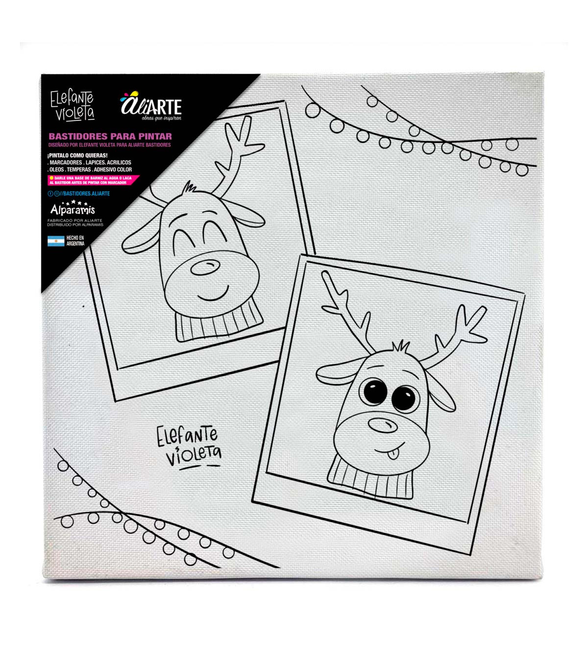 Un bastidor de tela de 20 x 20 cm de Aliarte con una obra navideña dibujada por la artista plástica Carolina Macellaro, conocida como Elefante Violeta, para que los chicos pinten una obra maestra de Navidad.