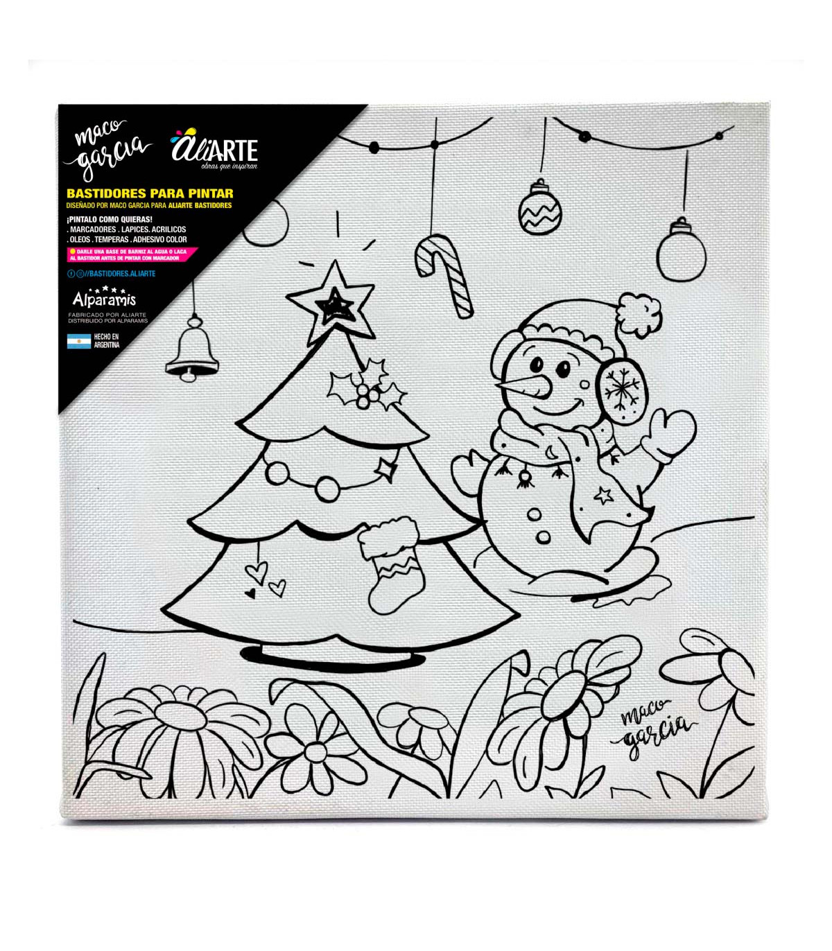 Un bastidor de tela de 20 x 20 cm de Aliarte con una obra navideña dibujada por la diseñadora Maco García para que los chicos pinten una obra maestra de Navidad.