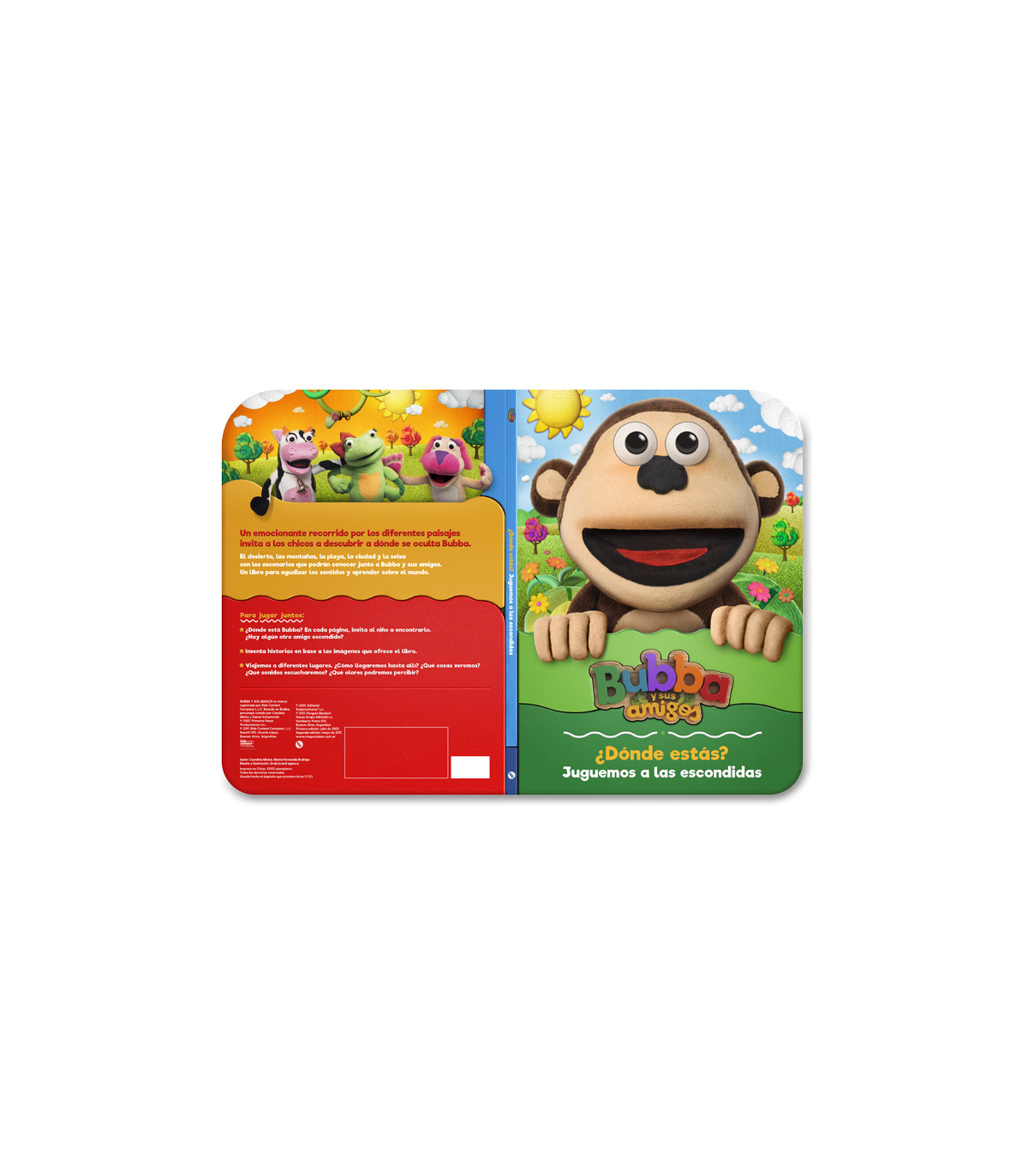 Libro didáctico de hojas de cartón y ojos móviles. Un emocionante recorrido por los diferentes paisajes invita a los chicos a descubrir a dónde se oculta Bubba.