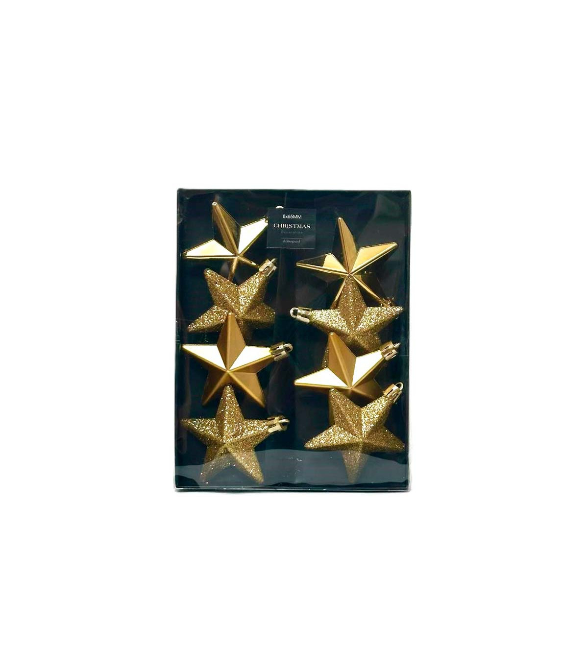 8 adornos plásticos navideños en forma de estrella de 6.5 cm de diámetro cada una para decorar el árbol de Navidad. Viene en una caja con tapa de acetato transparente.