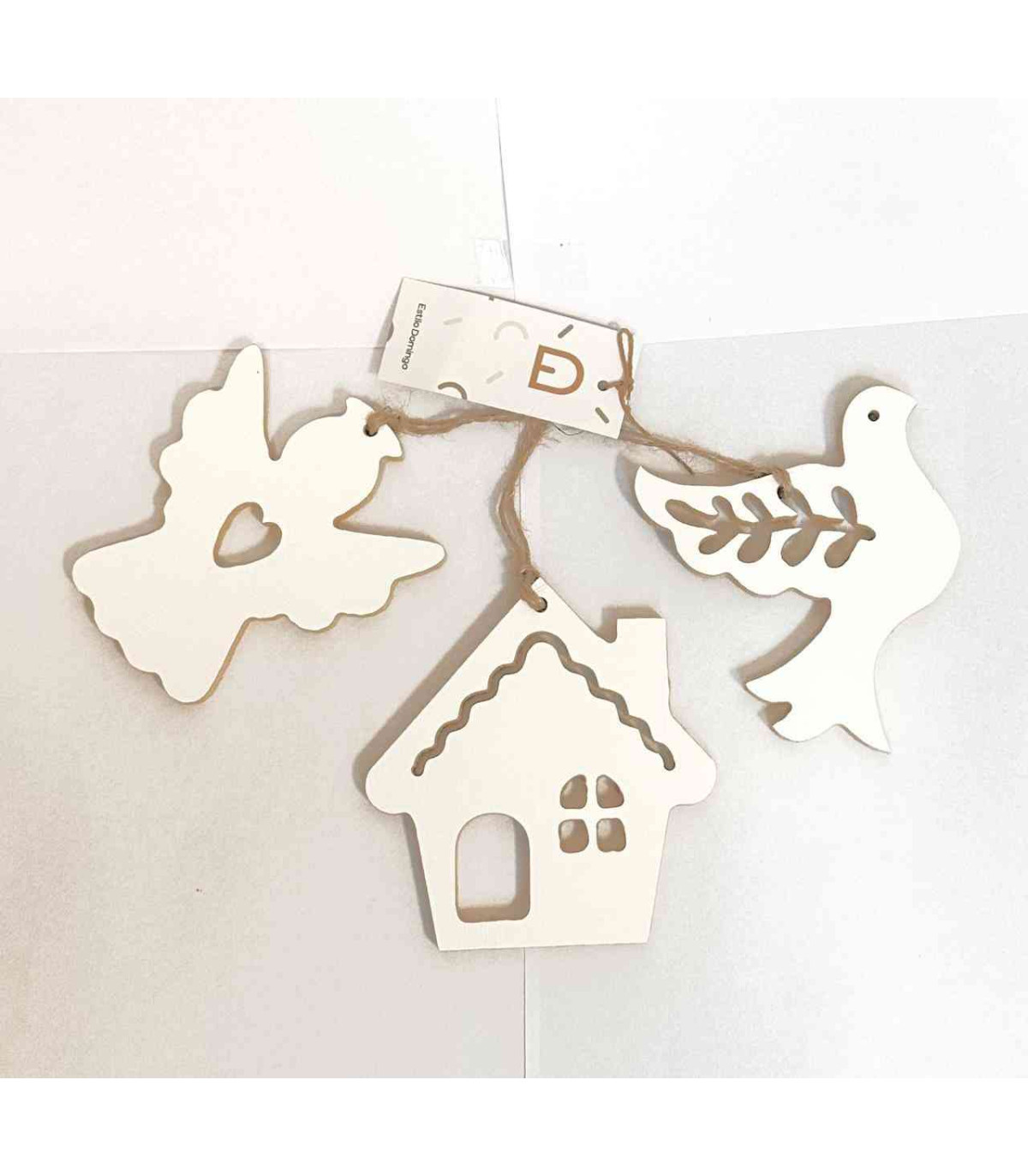 Un adorno de madera de 10 cm de alto para colgar con tres formas, una paloma, un ángel y una casita. Ideal para decorar el árbol, la casa o la mesa en Navidad.