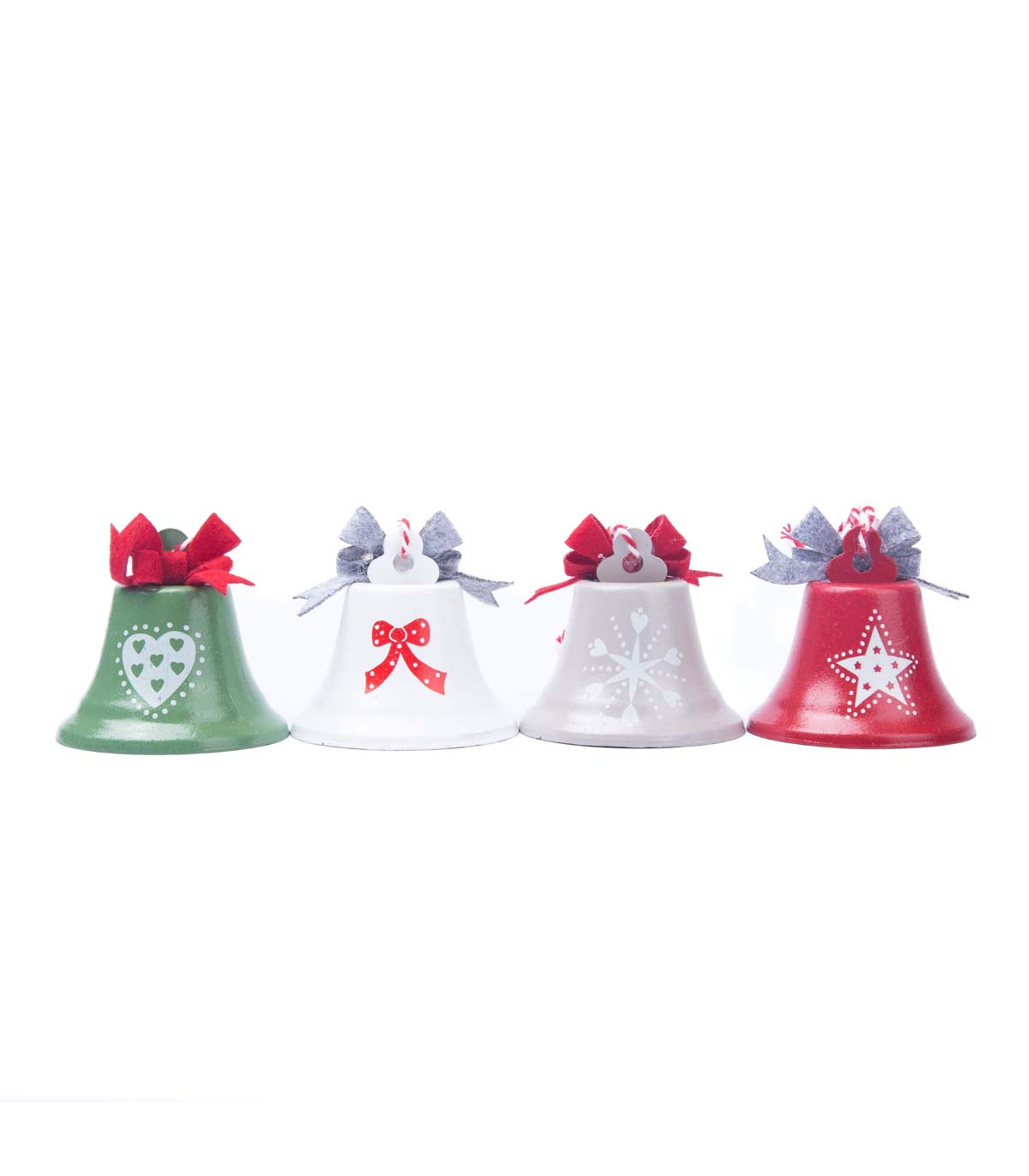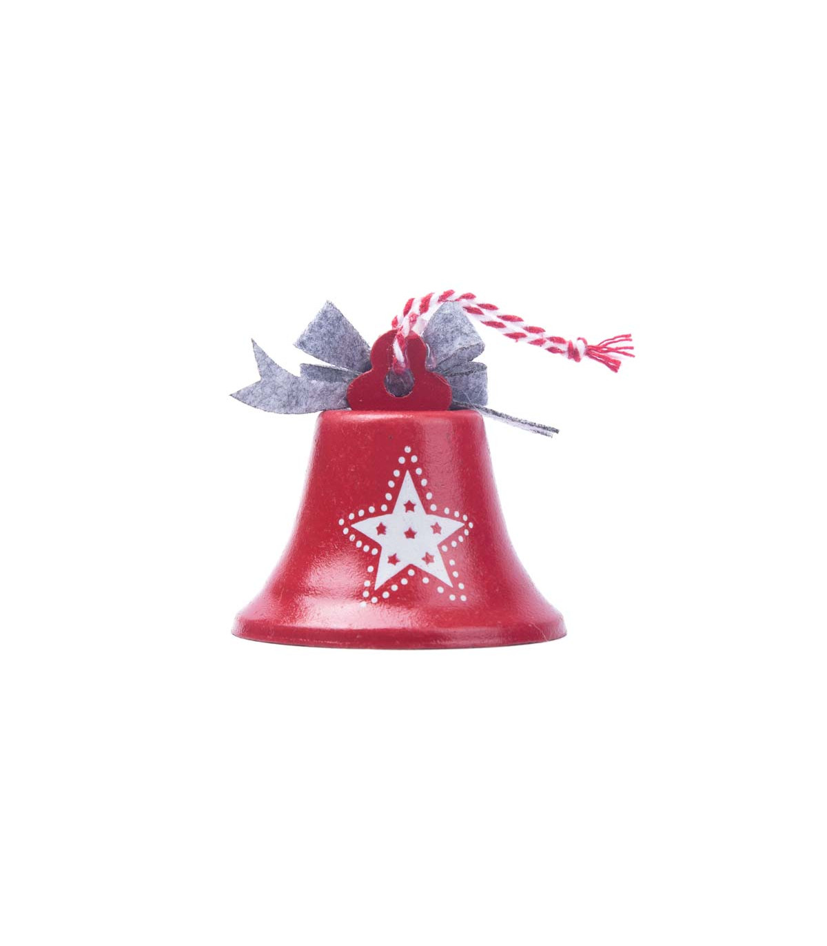 Un adorno metálico con forma de campana de 6 cm de diámetro para colgar con un lazo de fieltro en la parte superior. Viene en colores rojo, verde, blanco y gris. Ideal para decorar el árbol de Navidad.