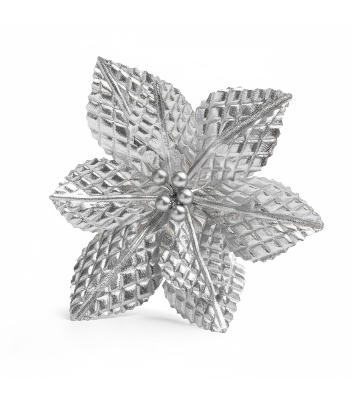 Un adorno con forma de flor de Estrella Federal de 22 cm de diámetro hecho en tela poliéster, goma espuma y alambre para decorar el árbol de Navidad.