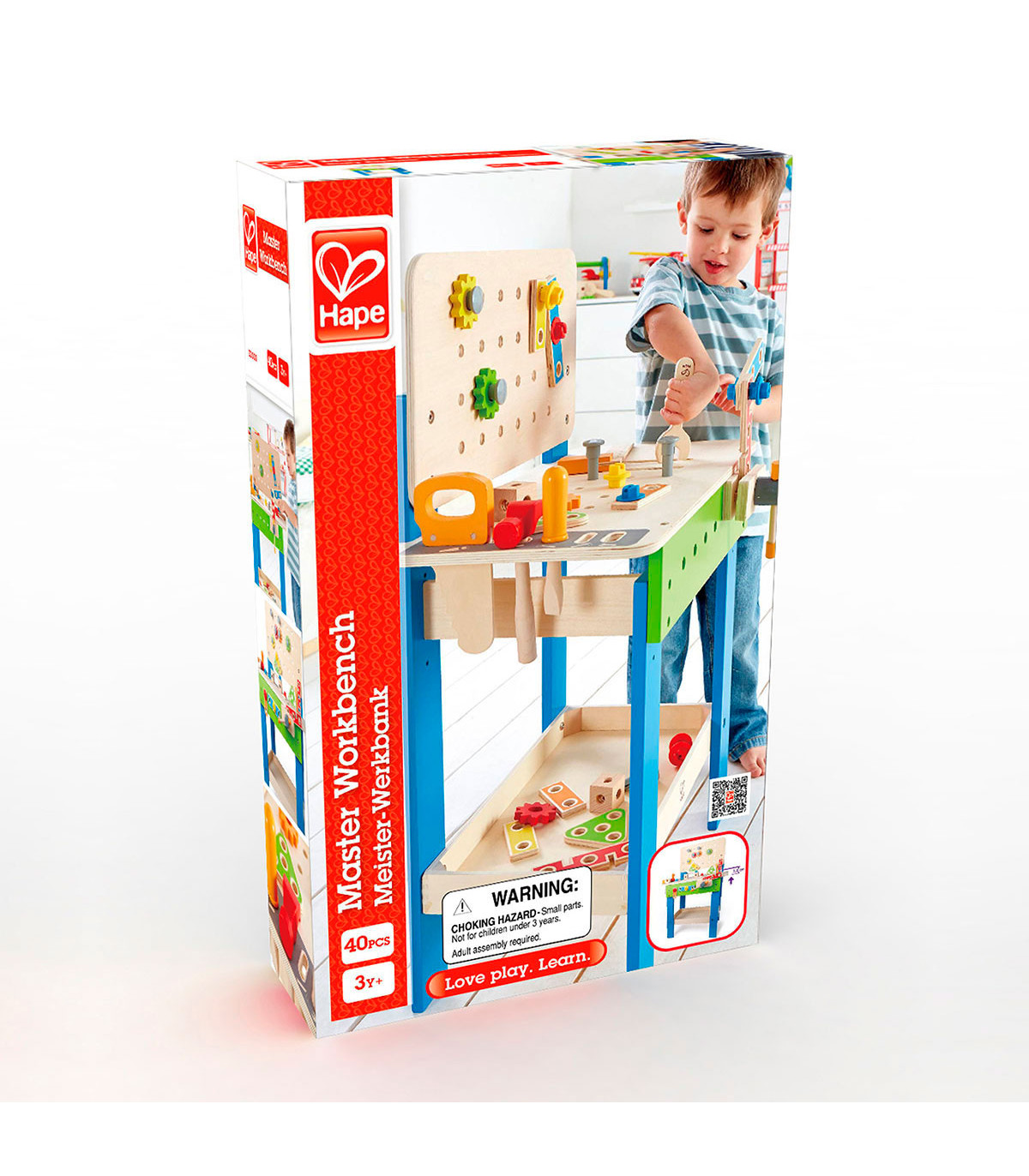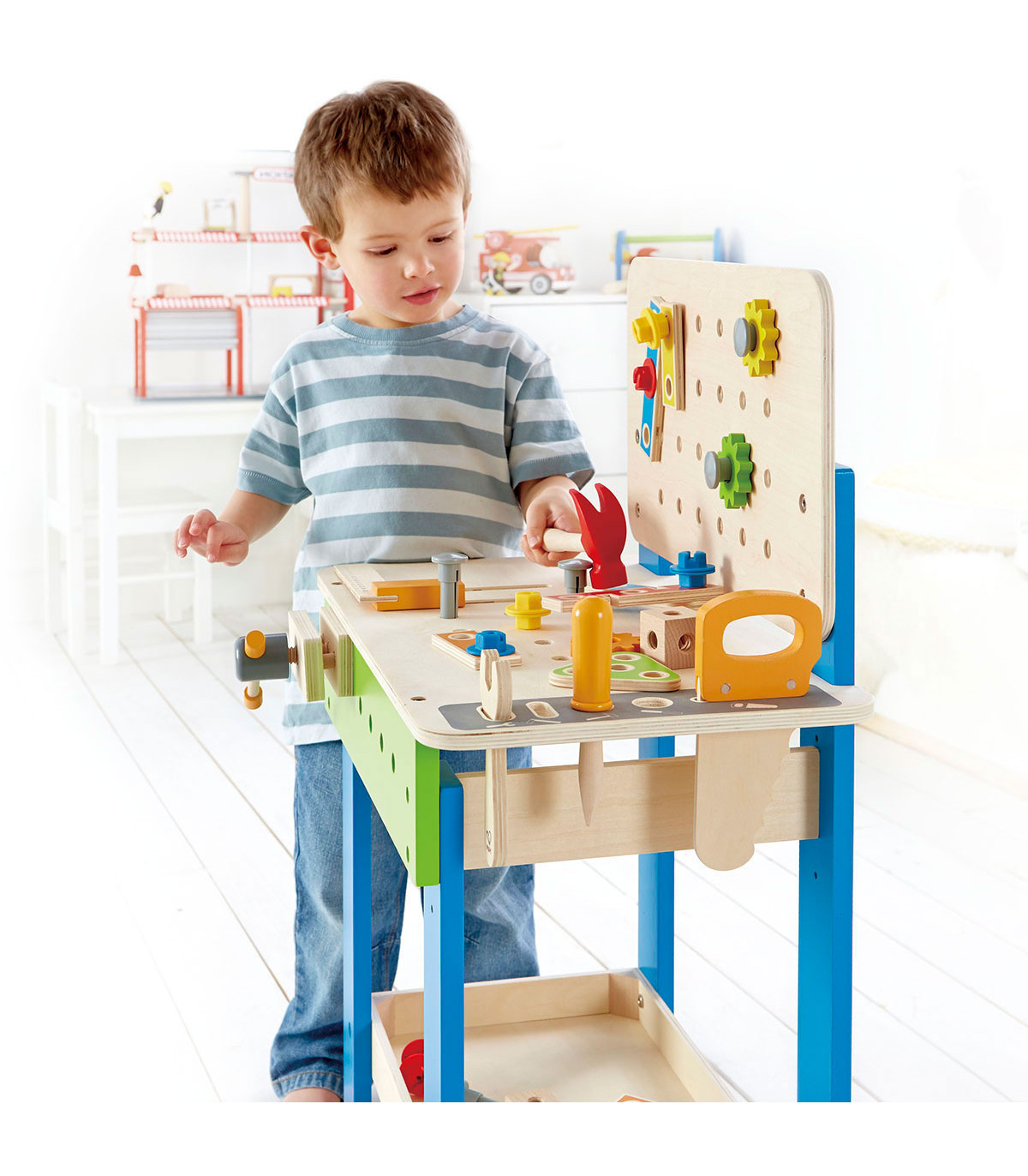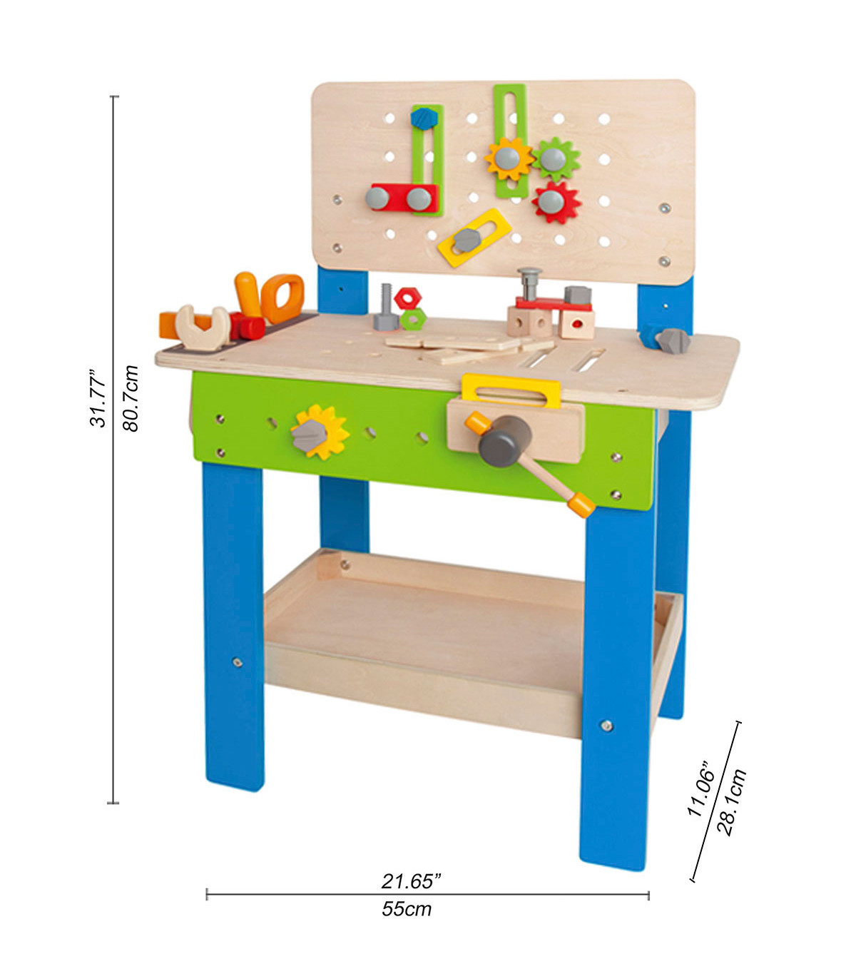 Los pequeños constructores con grandes ideas pueden trabajar directamente en esta estación de aspecto profesional. Los estantes y el almacenamiento mantienen todas sus herramientas y suministros al alcance de la mano.