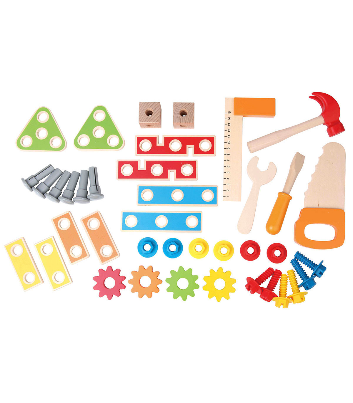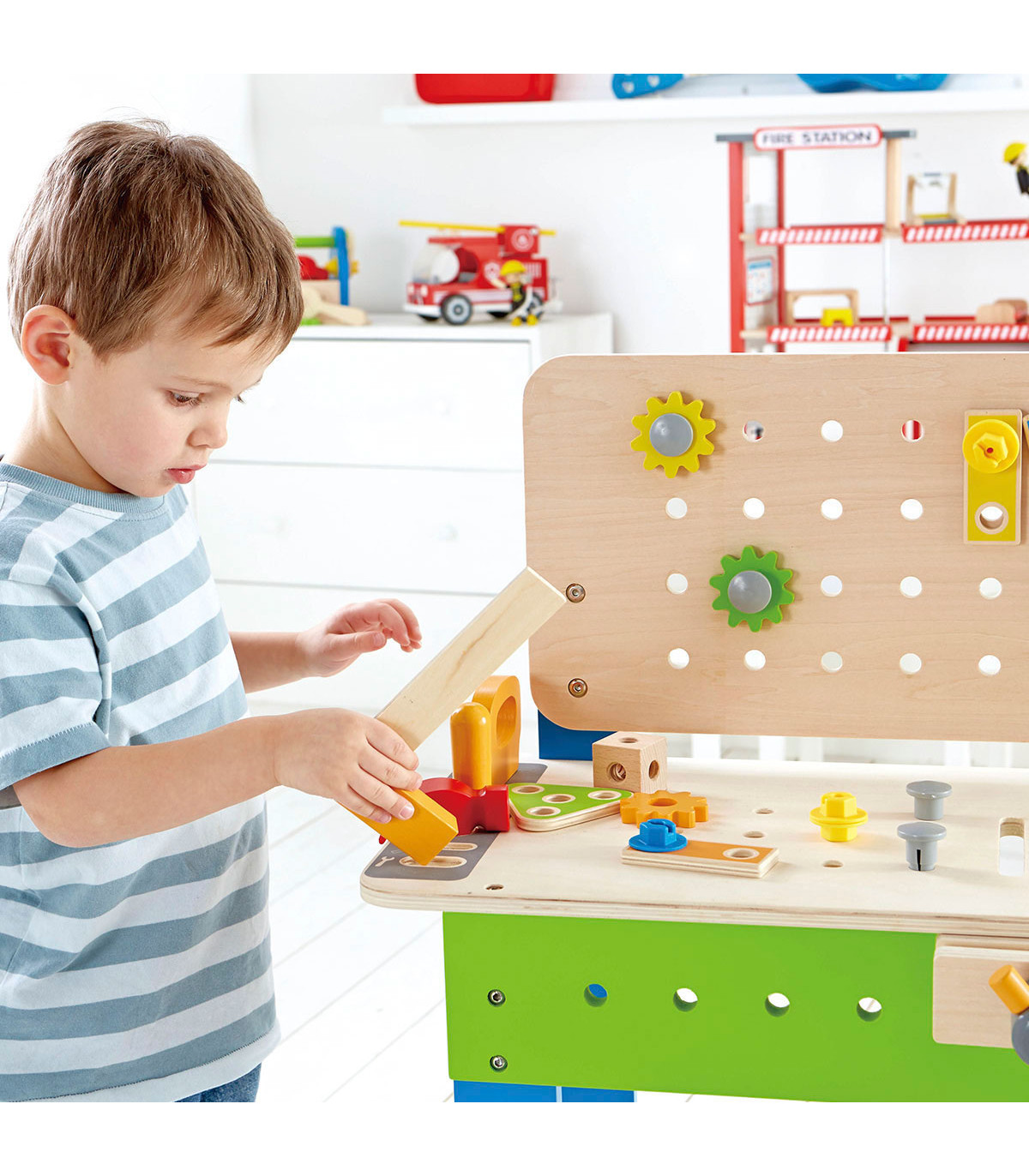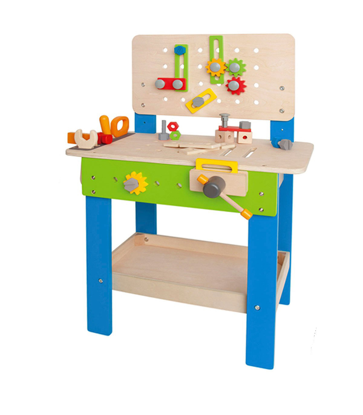 Los pequeños constructores con grandes ideas pueden trabajar directamente en esta estación de aspecto profesional. Los estantes y el almacenamiento mantienen todas sus herramientas y suministros al alcance de la mano.