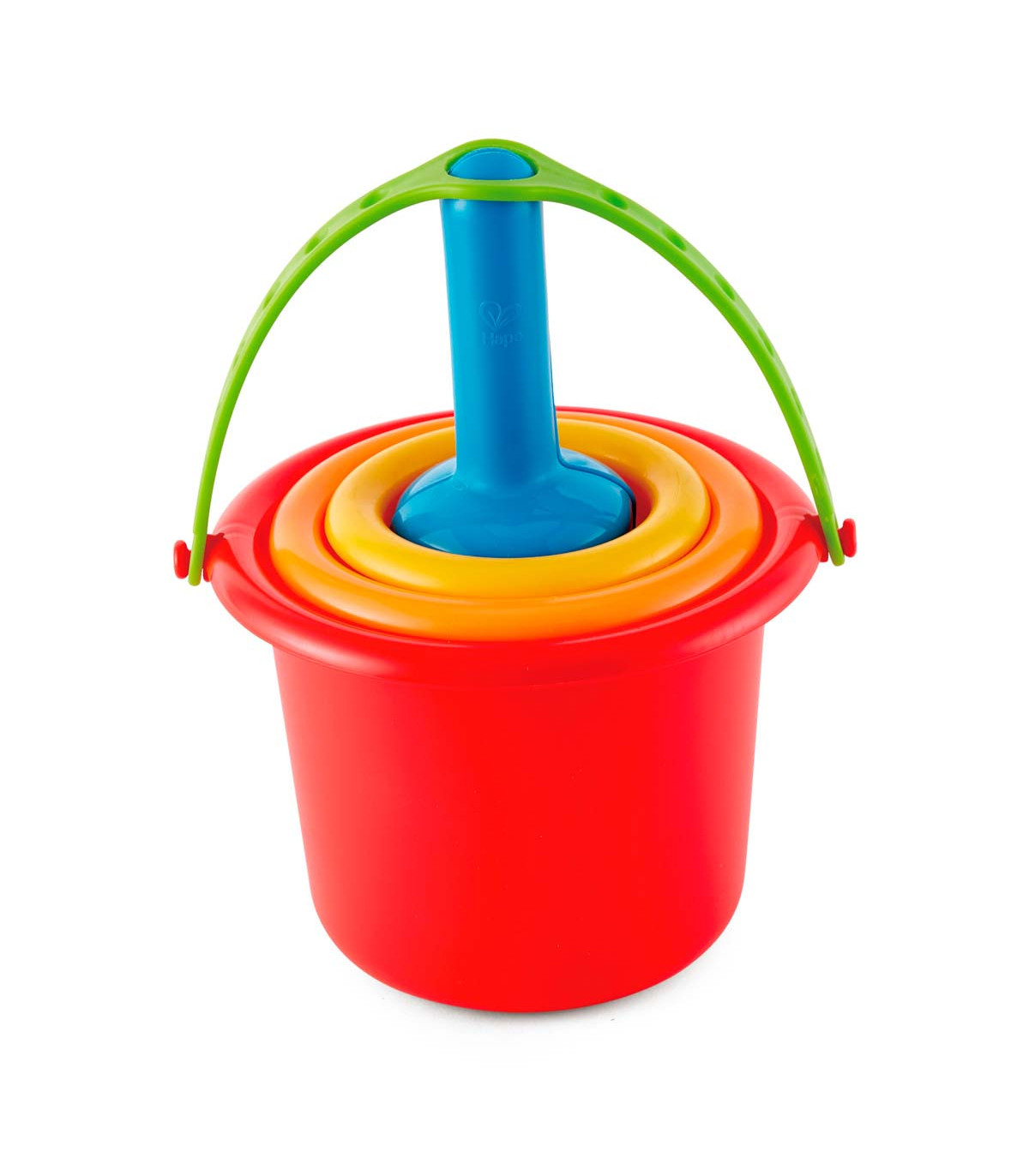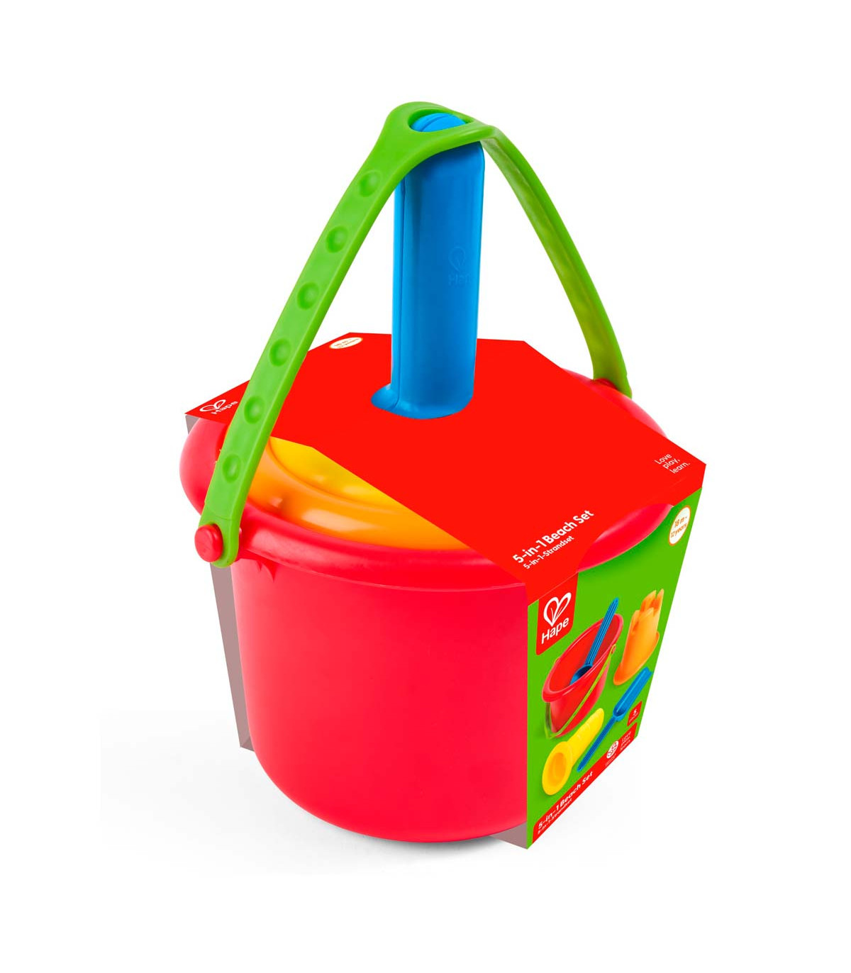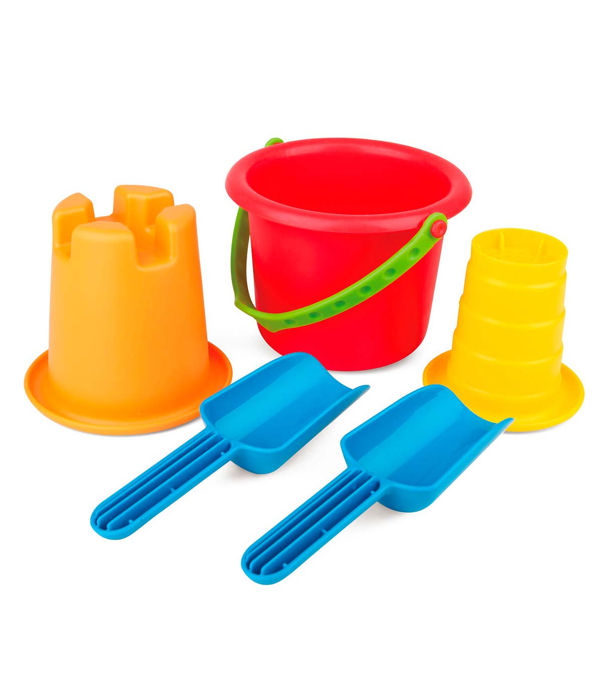 Un set para la playa que incluye un balde, un molde de castillo, un colador y dos palas. Los cinco juguetes se pueden apilar y encajar fácilmente para transportarlos y viajar con facilidad. Ideal para que jueguen dos chicos juntos o solos.