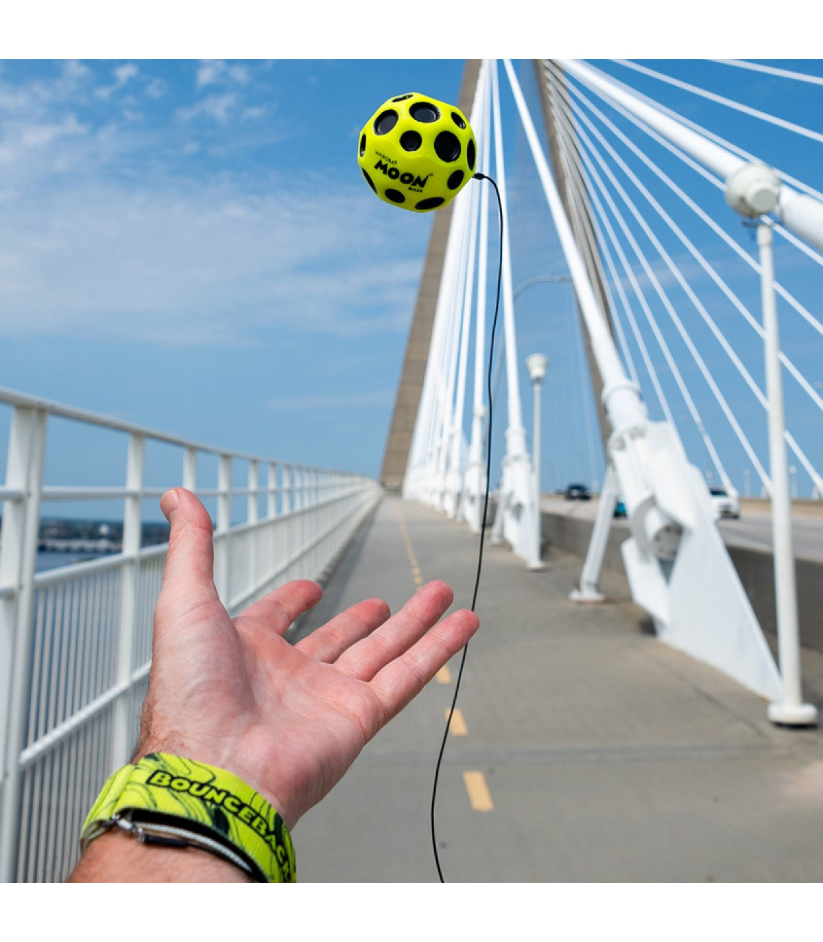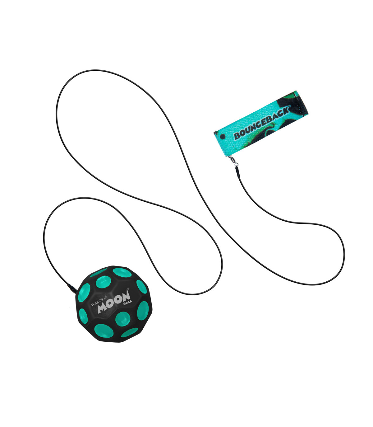 Llevá tu Moon Ball a pasear. Con Bounceback, la pelota va atada a tu muñeca con una pulsera ajustable. Tirala, hacela rebotar y atrapala en el rebote. Ideal para coordinar mano-ojo. No se desprende. Para chicos y grandes. Cuerda: 120 cm. Pelota: 6 cm.