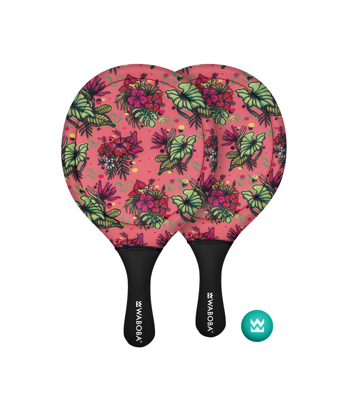 Set clásico de paletas resistentes al agua para la playa. Incluye 2 paletas con cubierta de neoprene y 1 pelota de goma que flota. Grip antideslizante, ideal para juegos en la playa o el agua. Edad: +8
