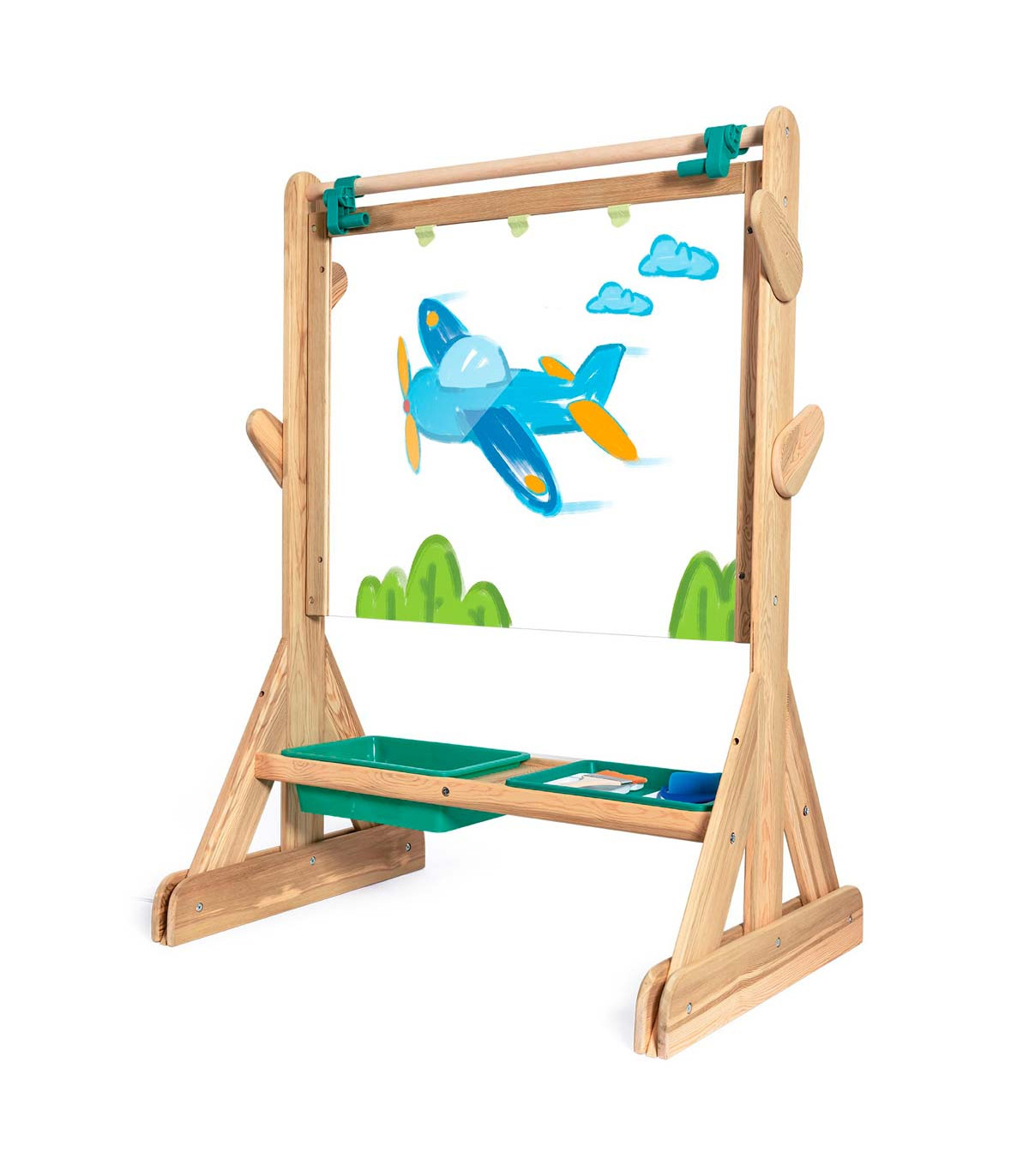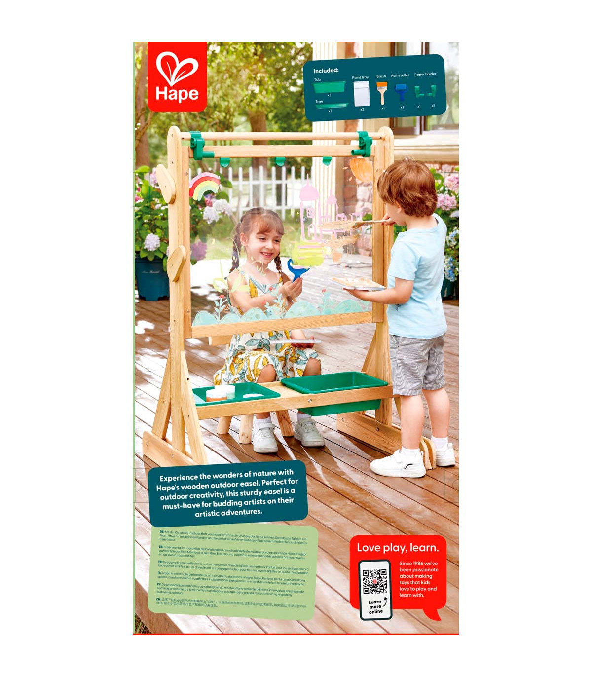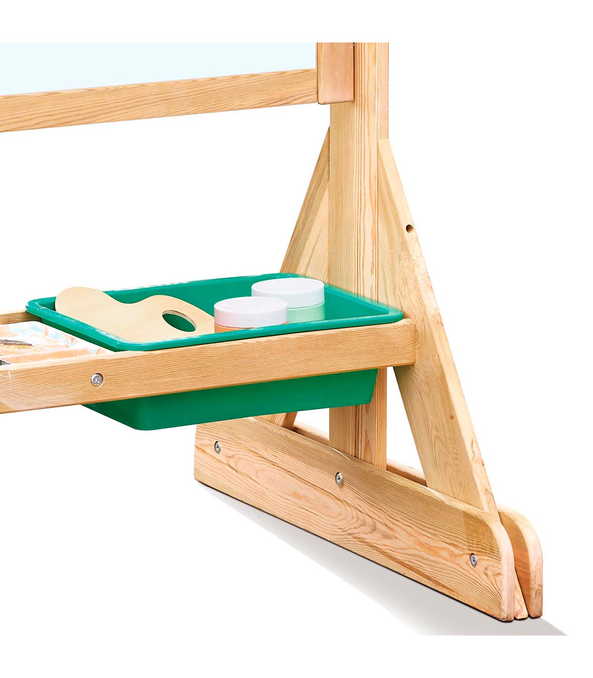 Una pizarra de madera duradera y anticorrosiva que resiste a la naturaleza, ideal para desplegar la creatividad al aire libre. Incluye un pincel, un rodillo de goma espuma, dos bandejas de pintura, dos clips para rodillo de papel y tres clips para hojas.
