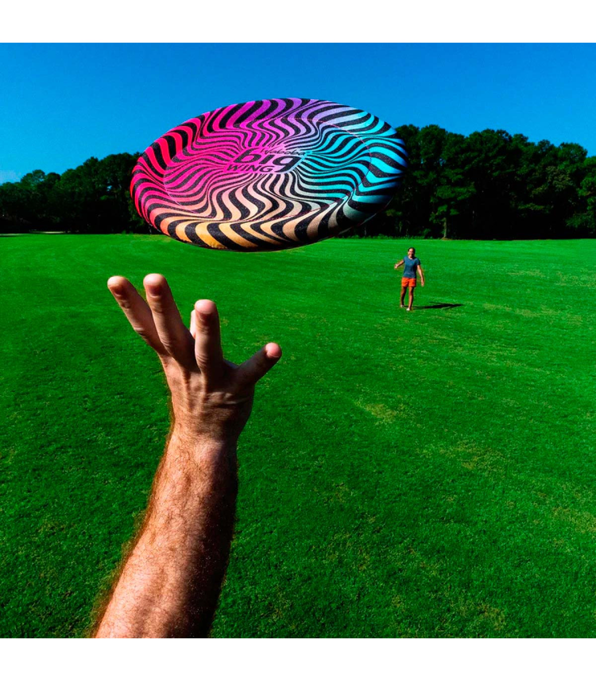 Bigwing tiene dos diseños en uno y vuela en ambos sentidos, tanto si lo lanzas desde arriba como desde abajo. Su diseño ligero permite un vuelo giratorio lento, es suave y fácil de atrapar. Disco recubierto de tela de 30 cm de diámetro no apto para agua.