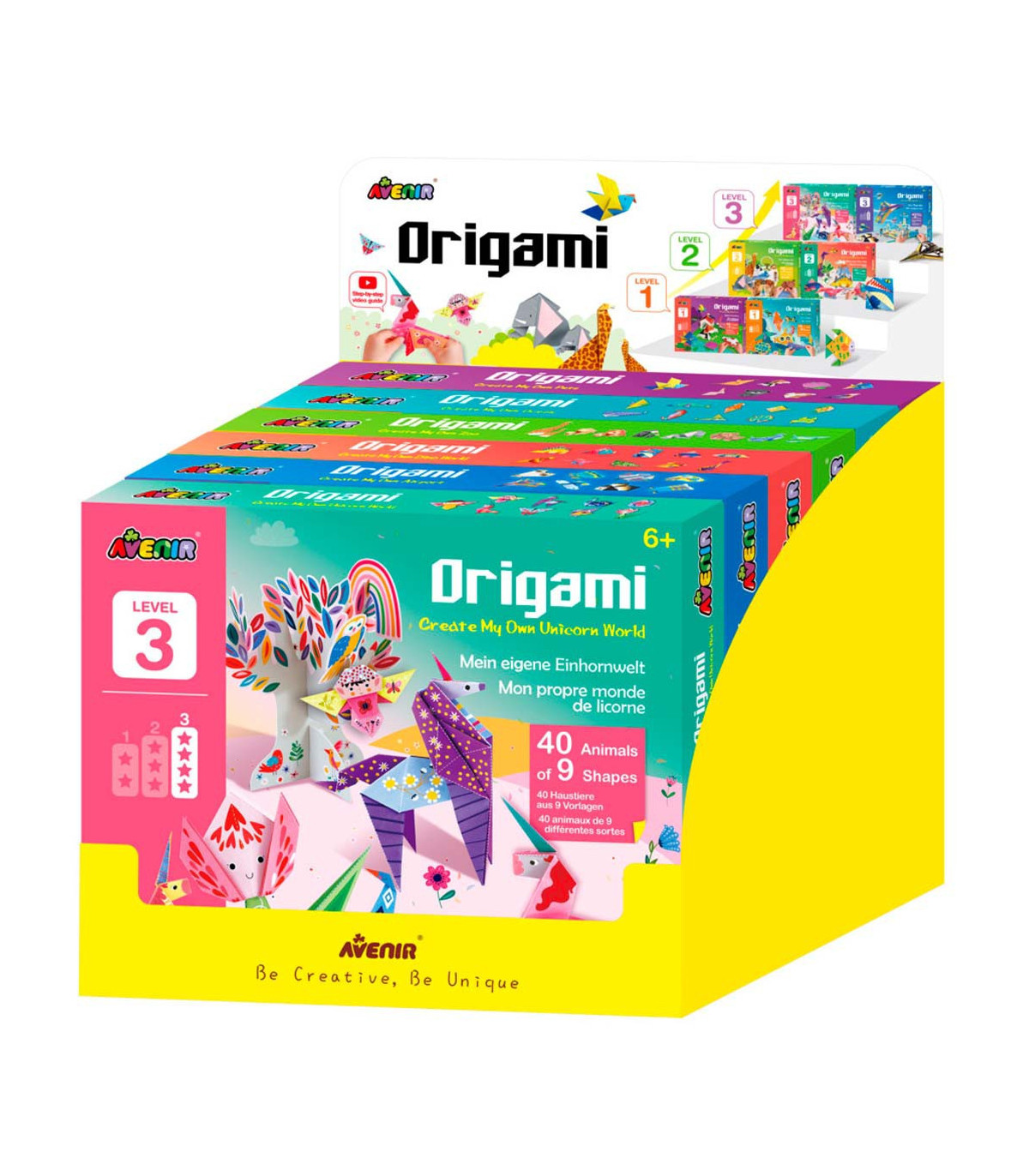 Un exhibidor con 6 unidades de kits de origami en 6 diseños distintos. Cada uno incluye 40 hojas para crear 8 animales, 2 piezas de cartón, 1 póster y un intructivo de armado. Edad a partir de 5 años.
