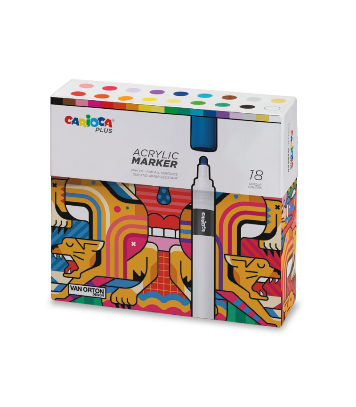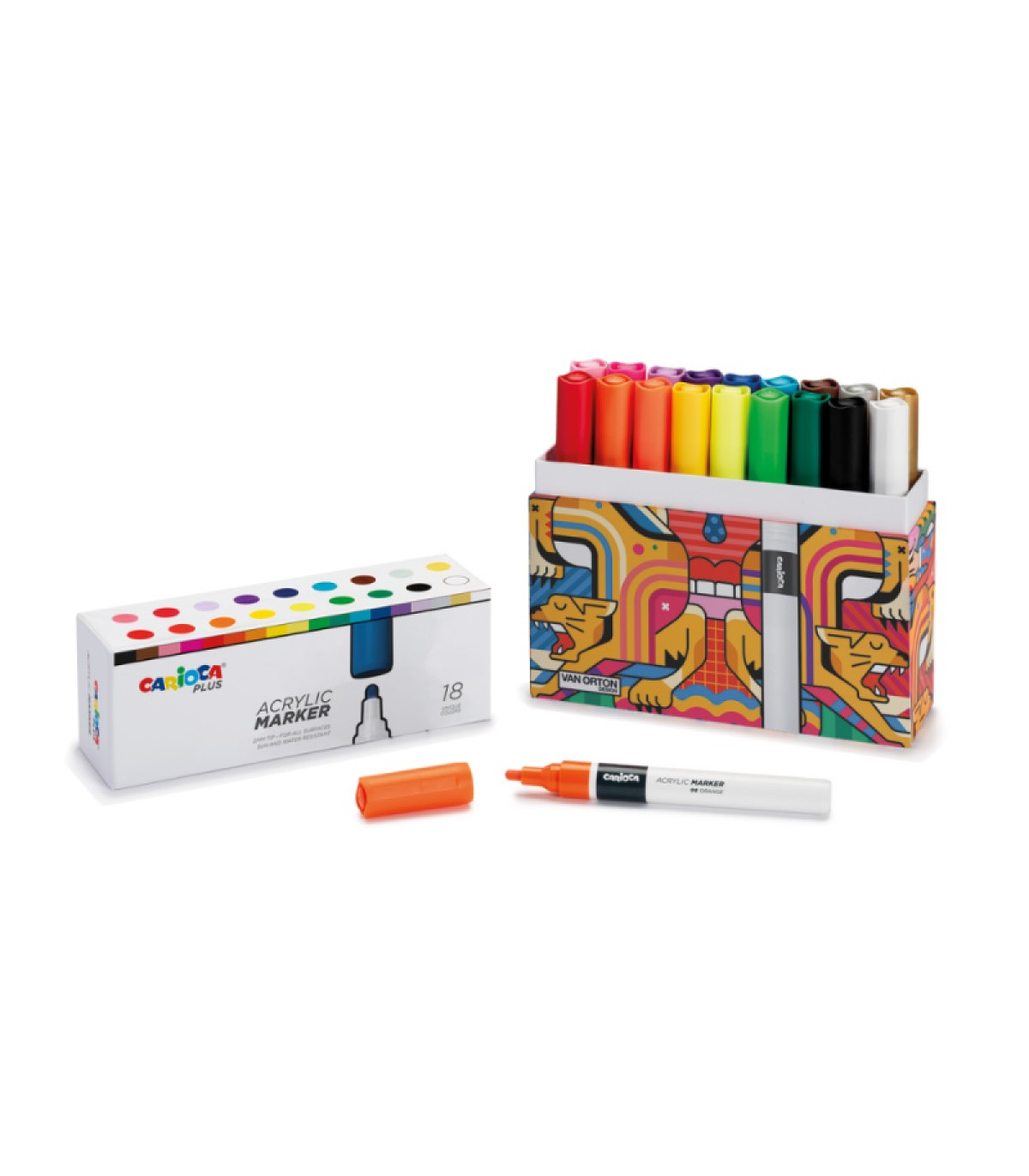 Una caja rígida con 18 marcadores acrílicos de tinta acrílica súper pigmentada. Escribe sobre todas las superficies. Punta de 2 mm que se activa fácilmente y no se seca al aire. Colores resistentes a la luz.