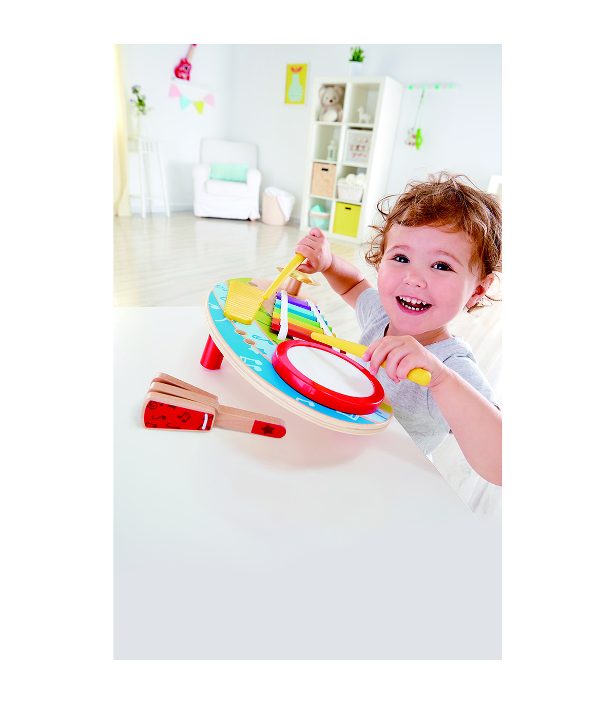 Para convertirse en una banda de una sola persona con esta increíble mesa de instrumentos múltiples. Incluye tambor, xilofón, platillo, dos palillos y más. Para que los chicos den sus primeros pasos musicales y estimular la coordinación ojo-mano.