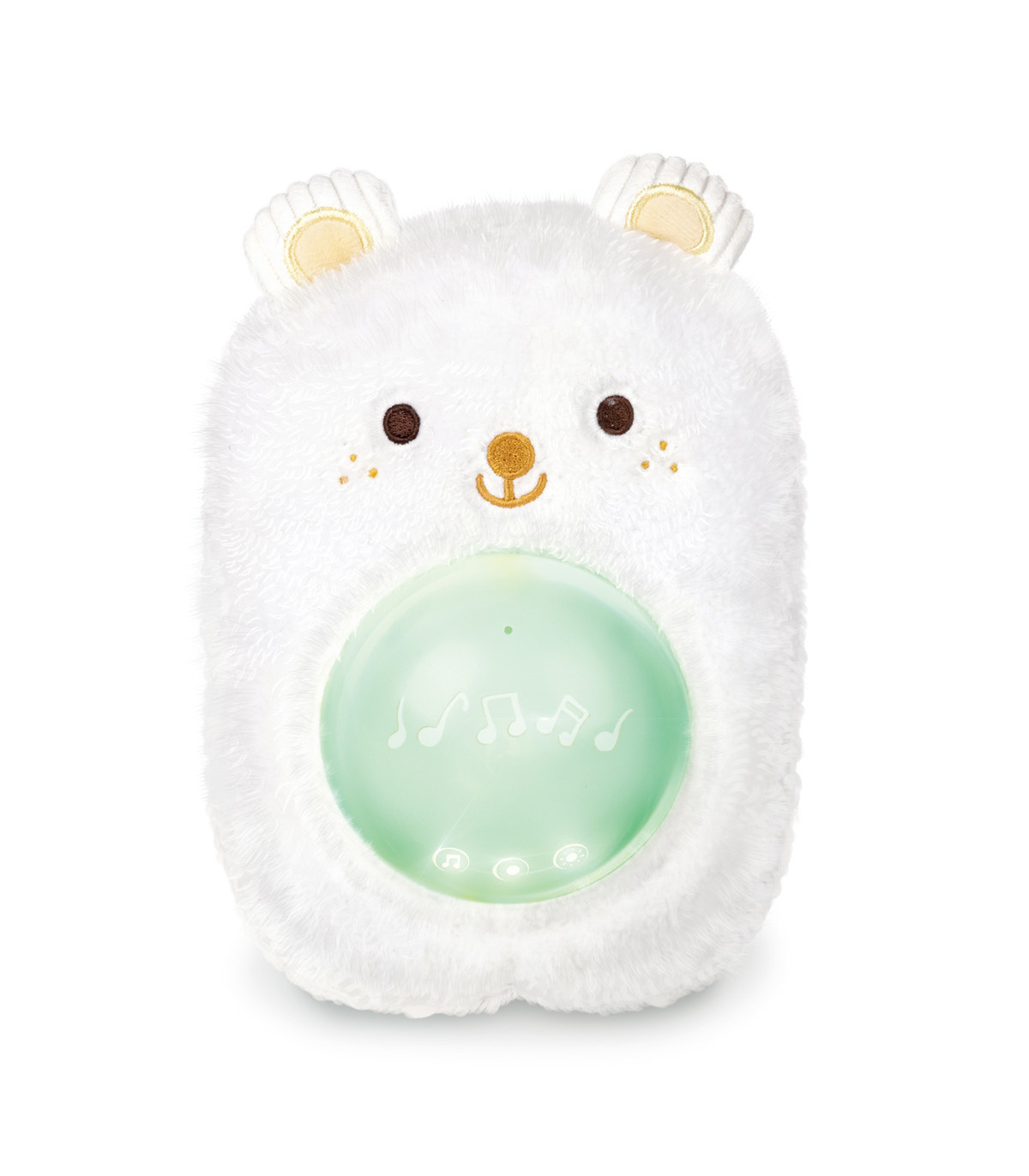 Una luz de cuna de peluche con forma de oso polar. Con luz suave, efectos de sonido naturales y canciones de cuna relajantes para que los peques se duerman plácidamente. Incluso podés grabar 120 segundos de tu propia voz.