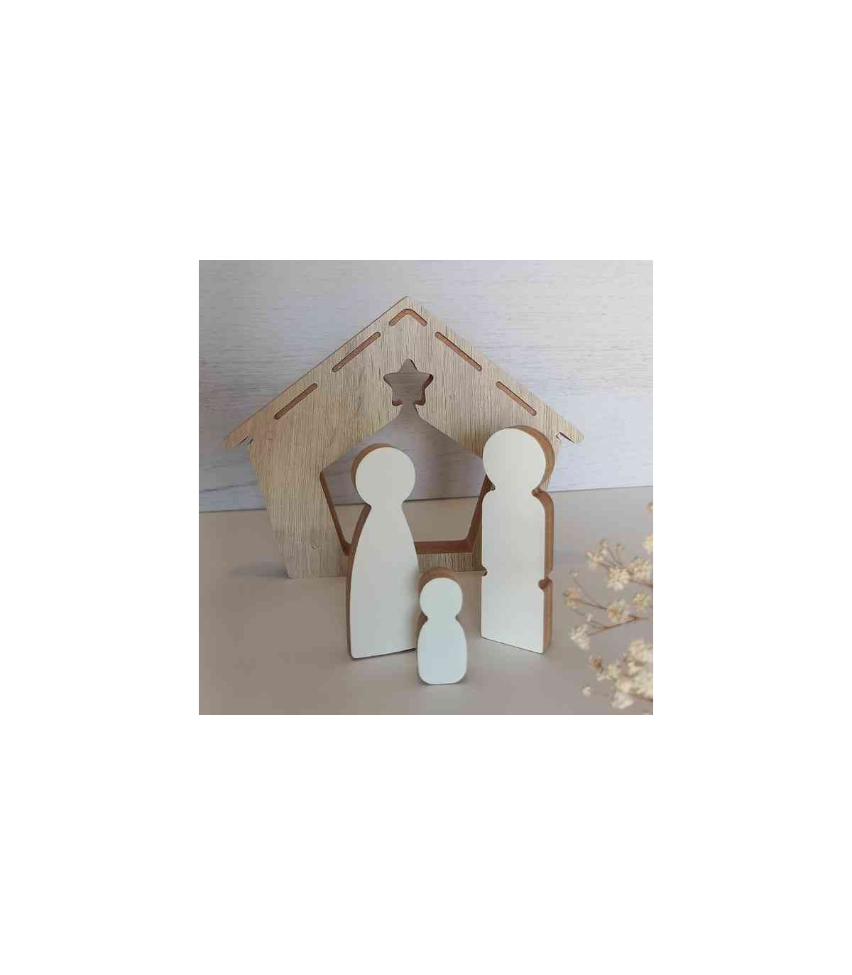 Un adorno de madera con las tres siluetas de la Sagrada Familia y el pesebre con una estrella calada, de 20 x 20 cm. Hecho en madera recuperada de los sobrantes de muebles hechos a medida. Viene en caja de cartón.