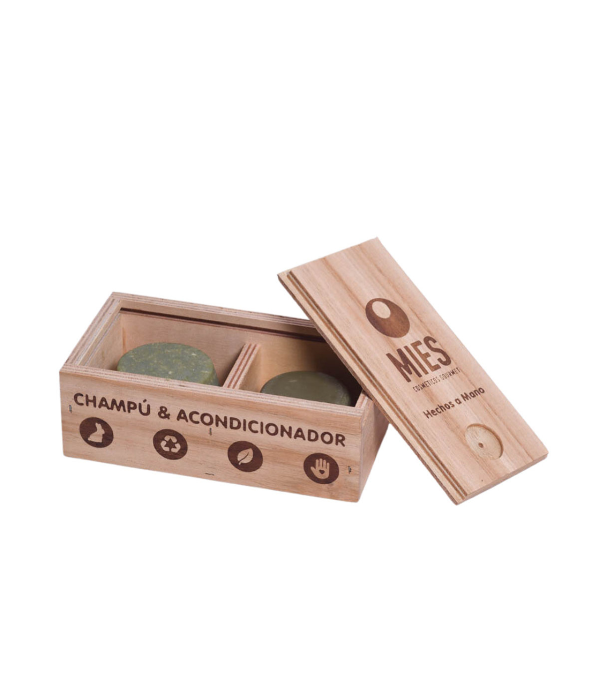 Regalá esta línea capilar sólida en un estuche exclusivo de madera. Contiene un champú y un acondicionador sólidos para todo tipo de pelo.