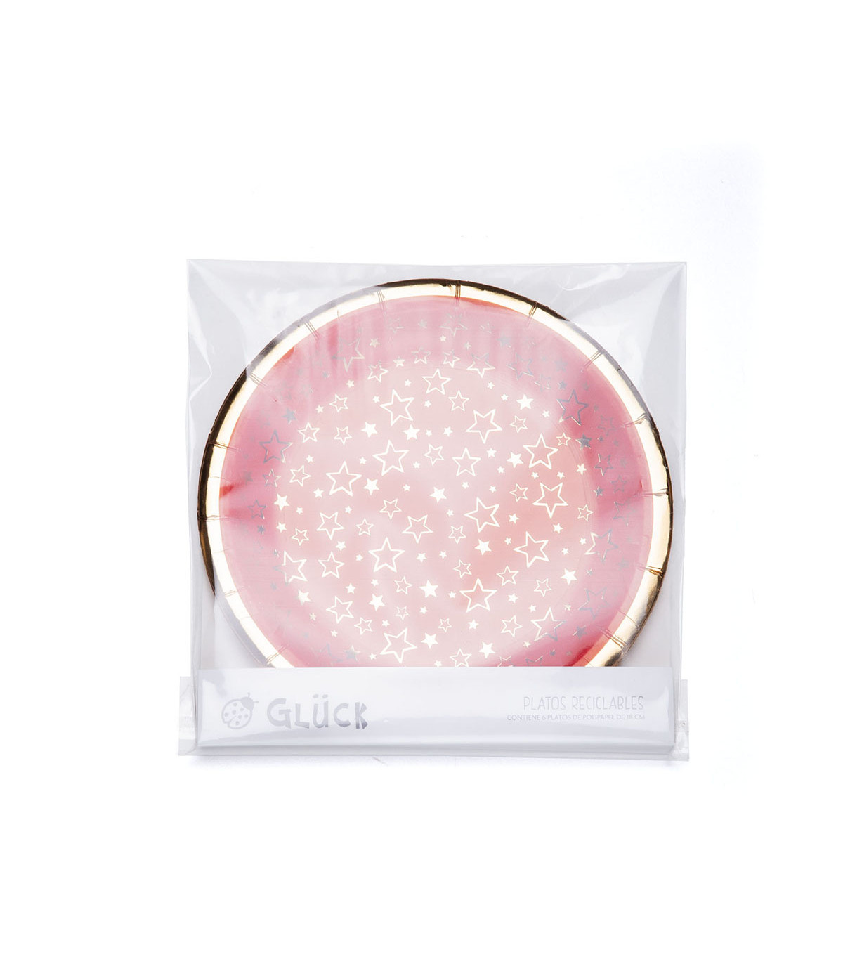 8 platos de cartón de 18 cm de diámetro con stamping dorado para decorar la mesa. Descartables y biodegradables.