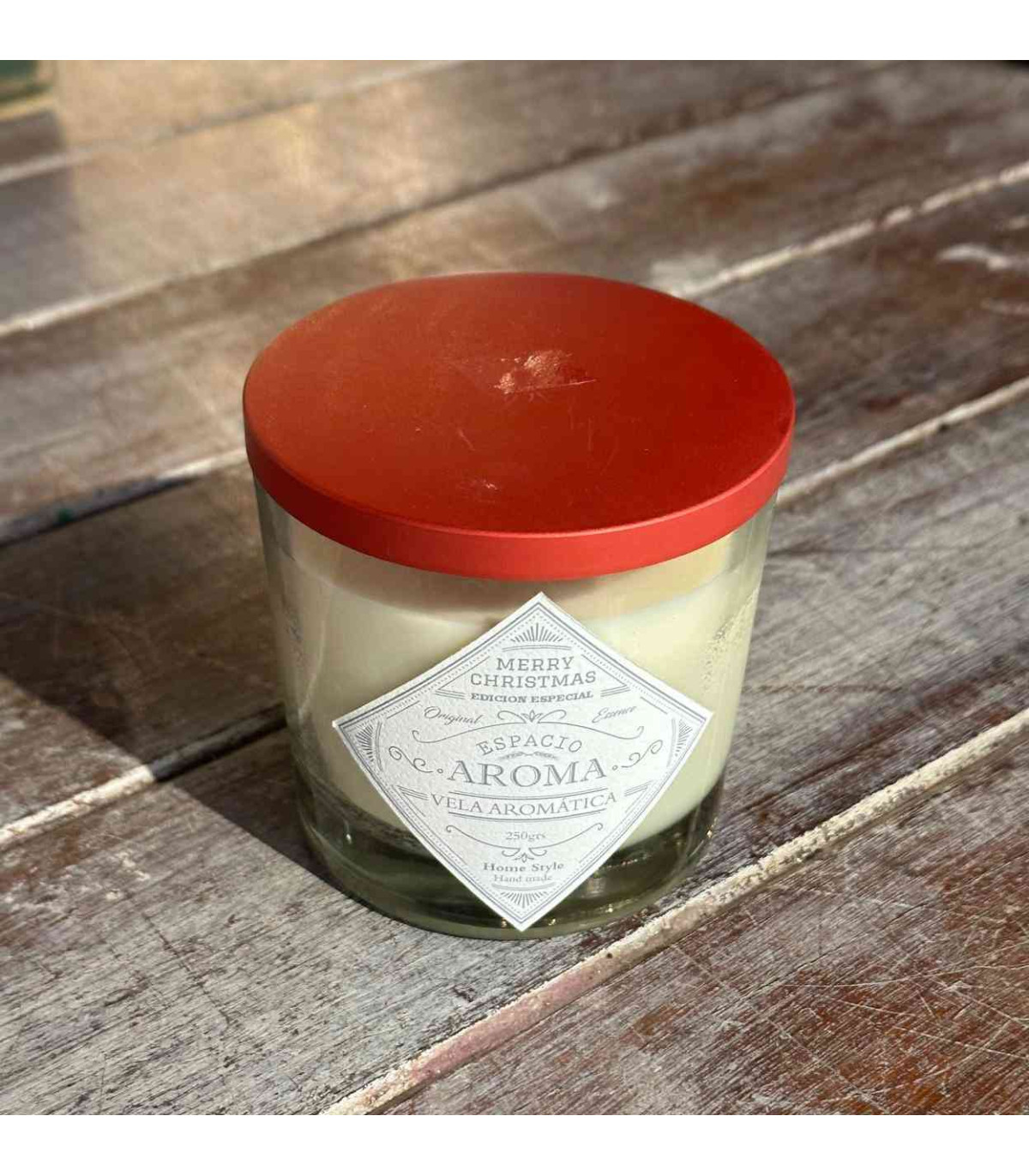 Una vela aromática de 250 g en envase de vidrio transparente reutilizable con una etiqueta navideña. Tapa metálica para apoyar o cubir la vela para mejor conservación. Aromas persistentes, duraderos que decoran los ambientes navideños con manzana y canela