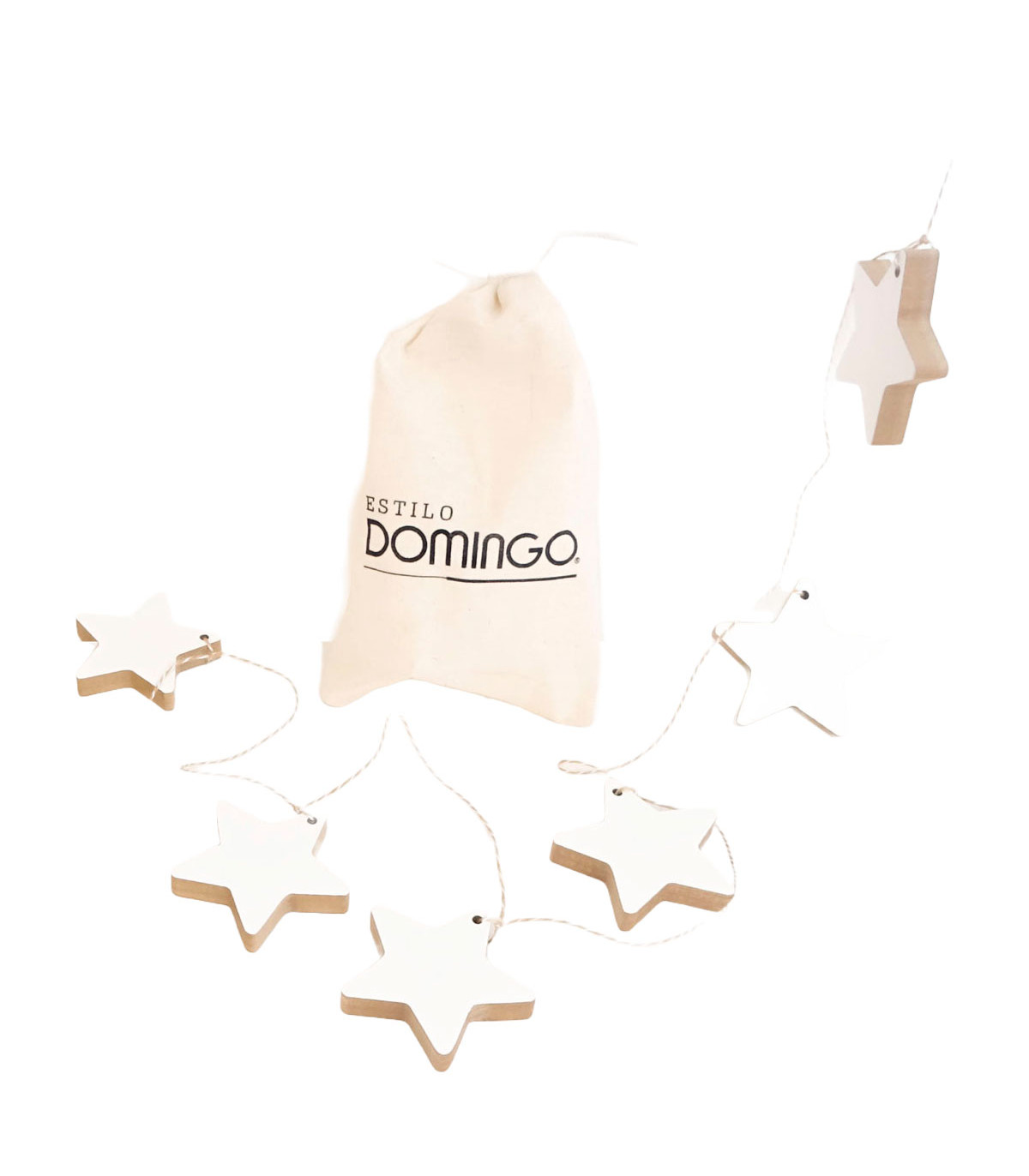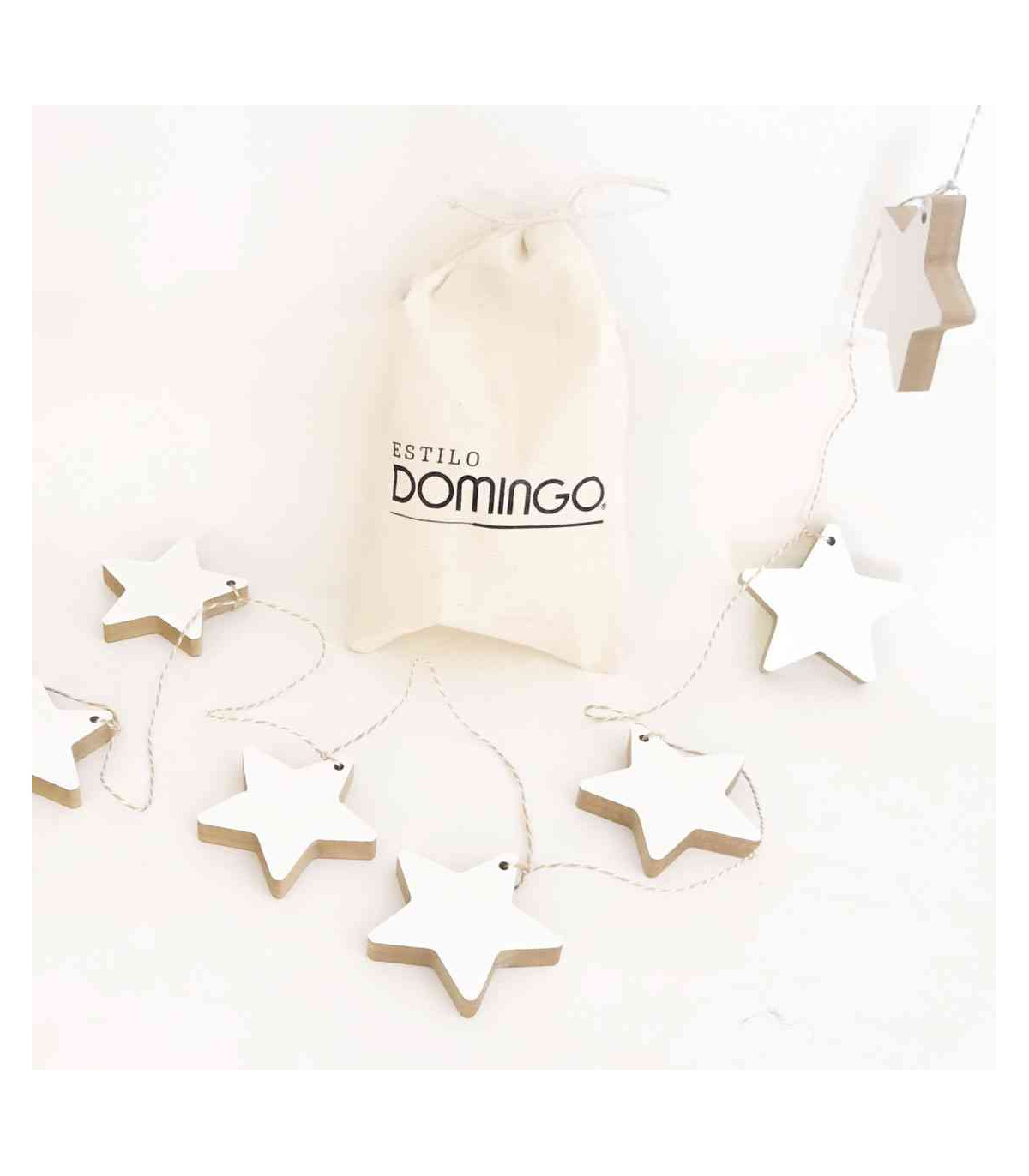 Una guirnalda de 2,5 metros de largo con 10 estrellas de madera de 7 cm, en caja de cartulina. Hechas en madera recuperada de los sobrantes de muebles hechos a medida.