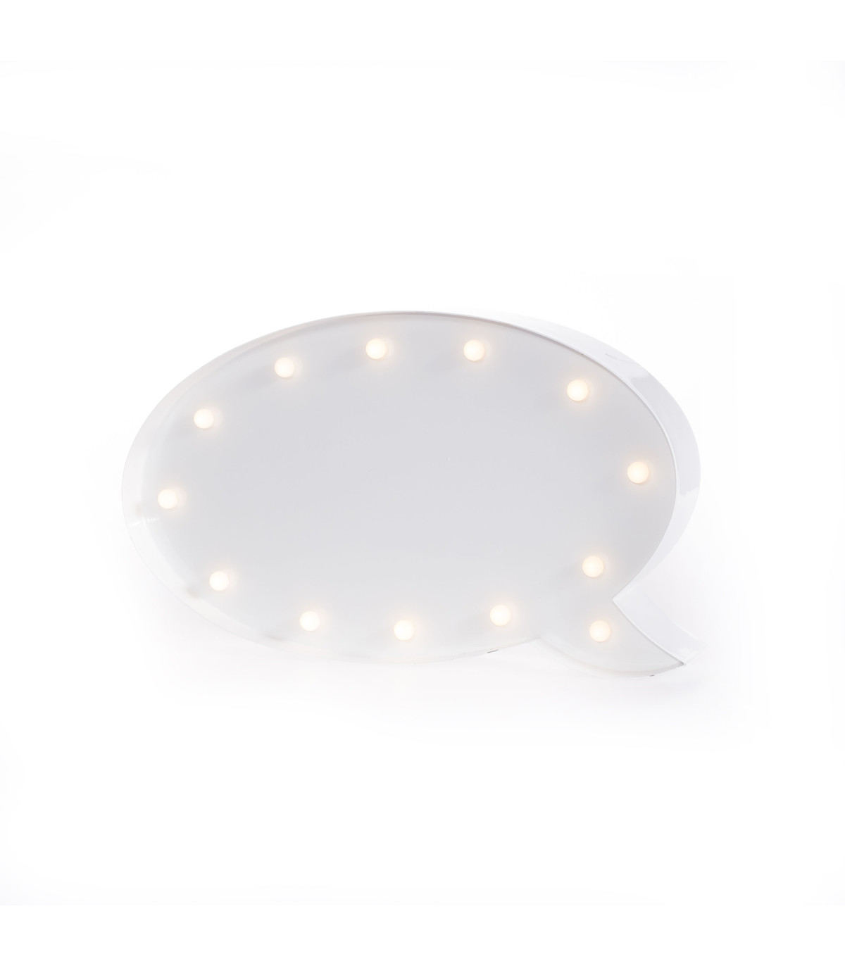 Cartel luminoso metálico color blanco con forma de dialogo con luces LED cálidas y timer. Incluye 70 letras magnéticas. Funciona con 3 pilas AA, no incluidas.
