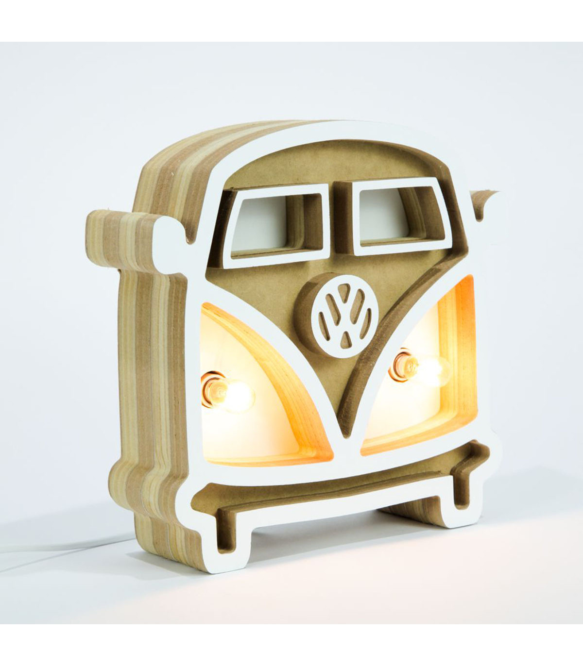 Una lámpara con forma de combi de 30x30 cm de madera melamina de 7.5 cm de espesor. Cable de 1.30 metros, interruptor y ficha inyectada. Incluye 2 focos incandescentes con rosca Mignon de 15 W. Hechos en madera recuperada de sobrantes de muebles a medida.