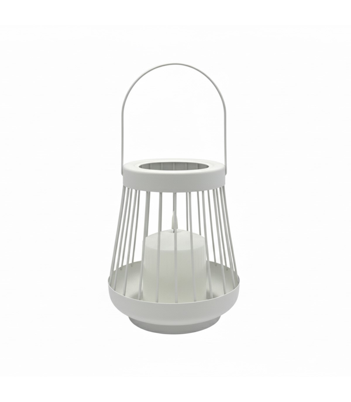 Un farol metálico de 26 cm de alto con una vela de luz LED blanca cálida de 7.5 cm de diámetro y 15 cm de alto. La llama titila con un efecto realista. Usa 1 pila CR2032 incluida. Incluye switch on-off.