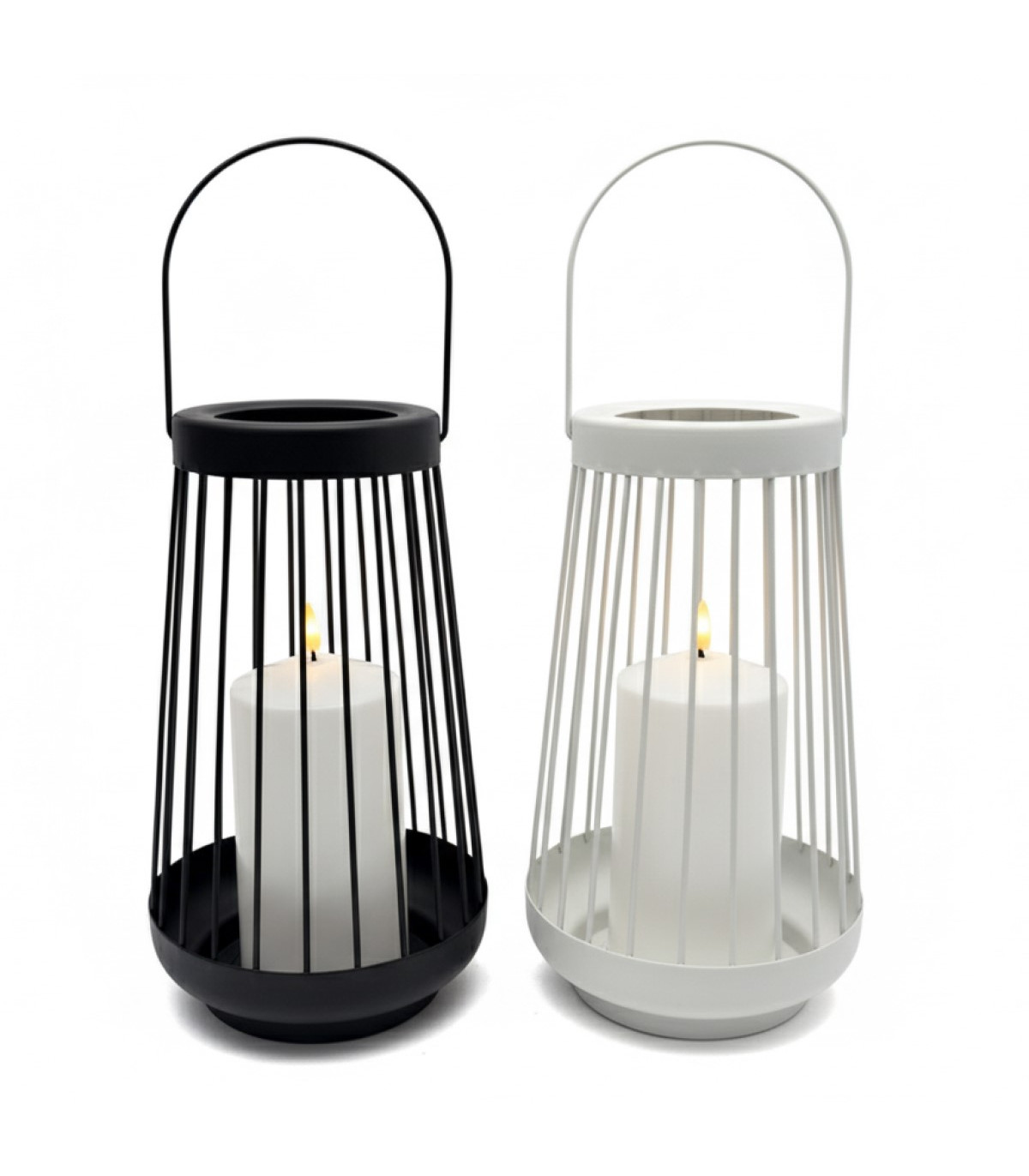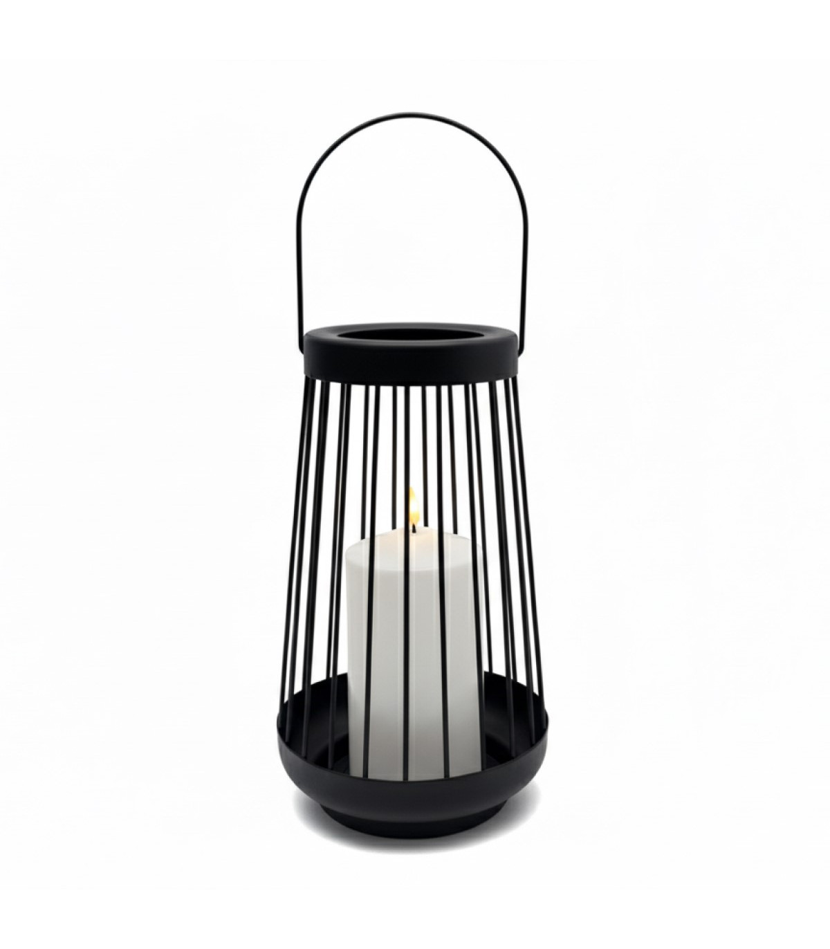 Un farol metálico de 26 cm de alto con una vela de luz LED blanca cálida de 7.5 cm de diámetro y 15 cm de alto. La llama titila con un efecto realista. Usa 1 pila CR2032 incluida. Incluye switch on-off.