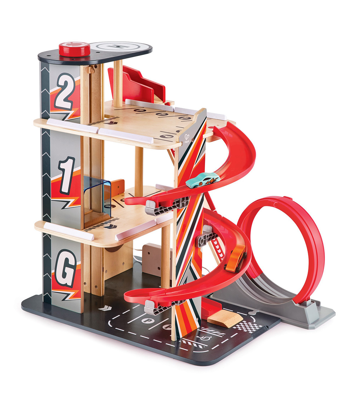Un garaje de 3 niveles ideal para tus autos. El montacargas puede subir tus autos a los distintos niveles. El garaje tiene una estación de servicio con panel giratorio, dos puntos de carga por energía solar, una rampa con giros y un circuito de saltos.