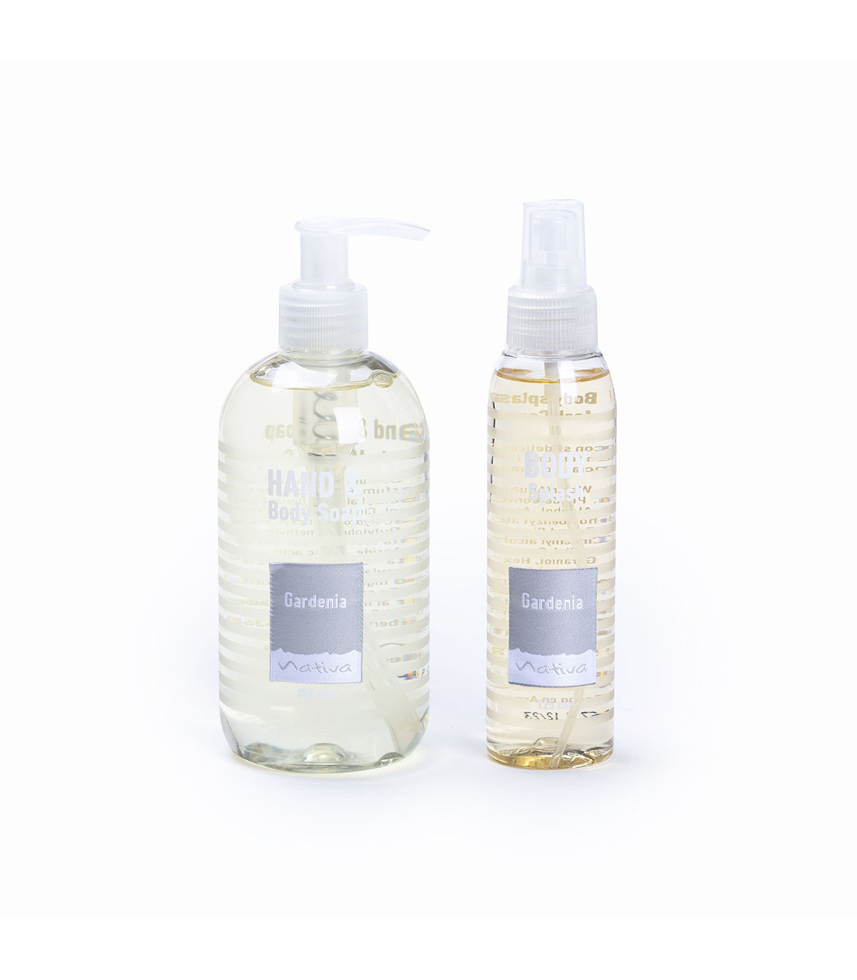 Una caja de cartulina con Diseñó que contiene un body splash y un jabón líquido Nativa. Fragancia: Harmony.