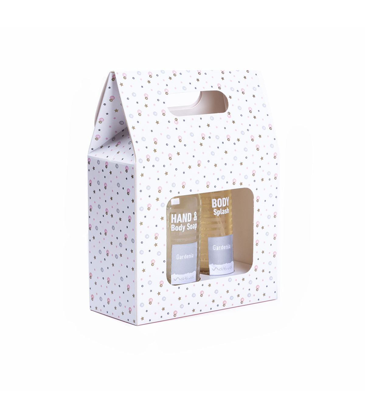 Una caja de cartulina con Diseñó que contiene un body splash y un jabón líquido Nativa. Fragancia: Gardenia.