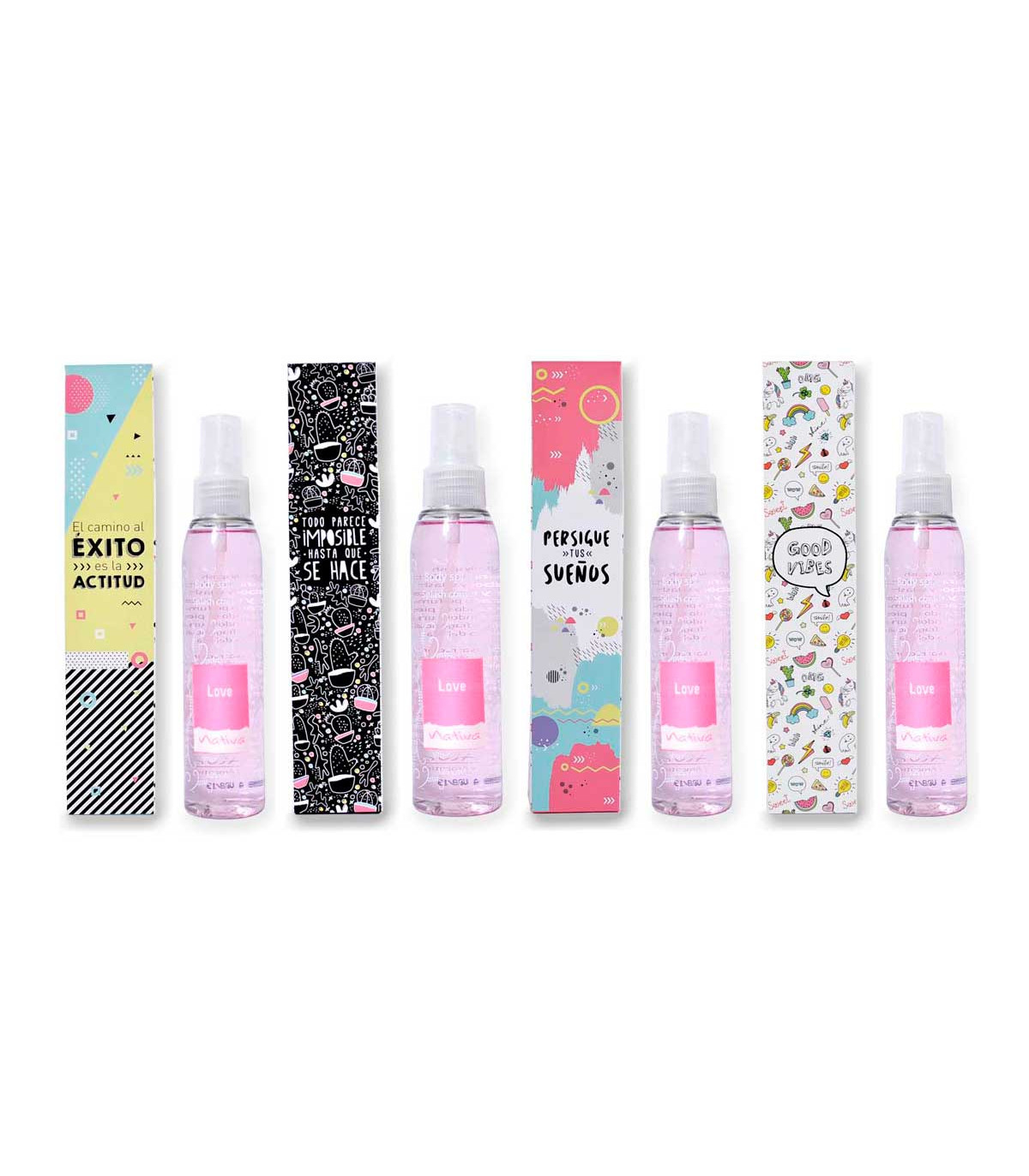 Un set con la colección completa de los body splash de la colección Teen de las Pequeñas Sorpresas de Glück. Incluye 4 cajas de cada uno de los 4 diseños de la colección. Cada caja contiene un body splash de 125 cm3 de fragancia Gardenia.